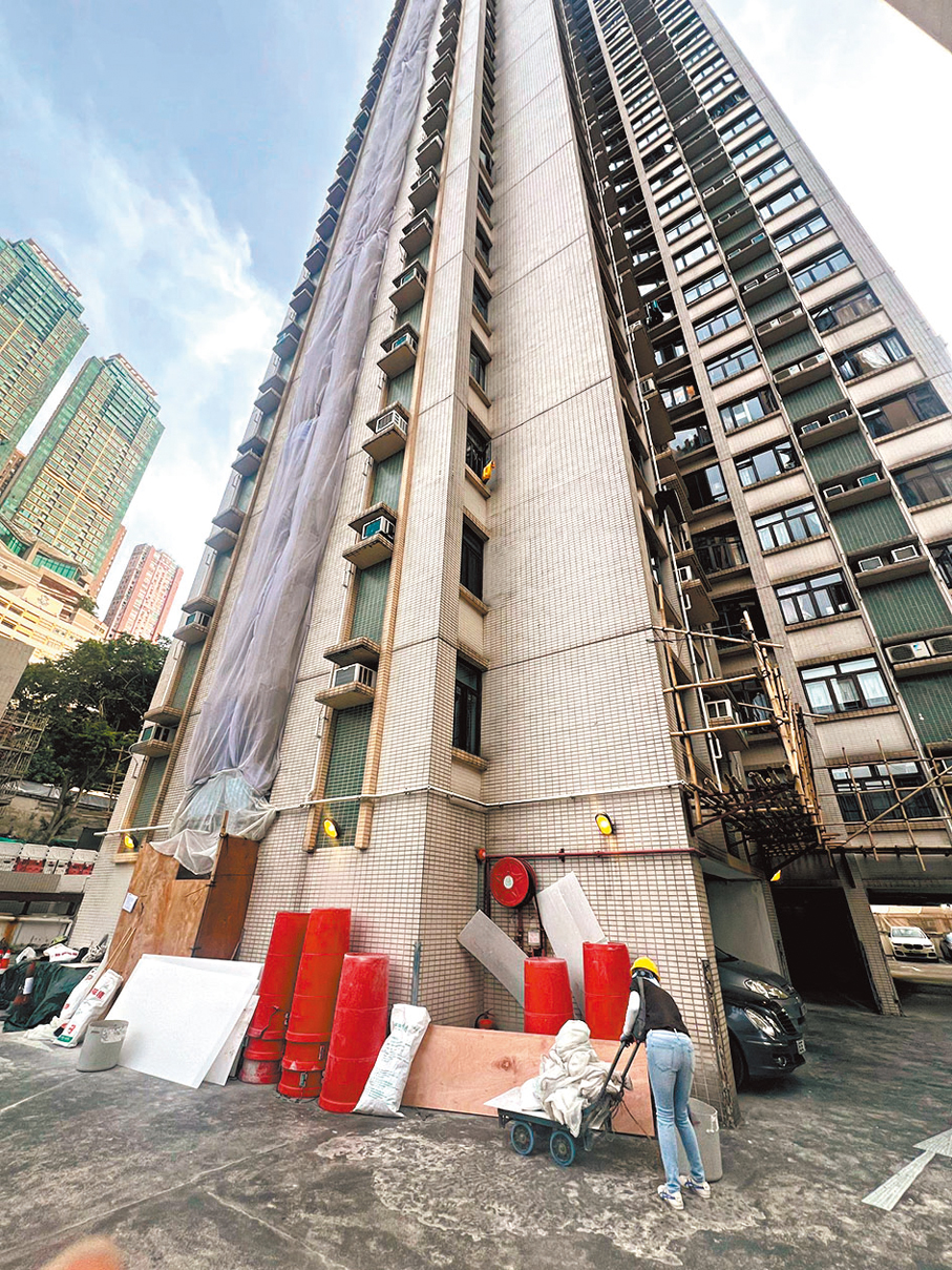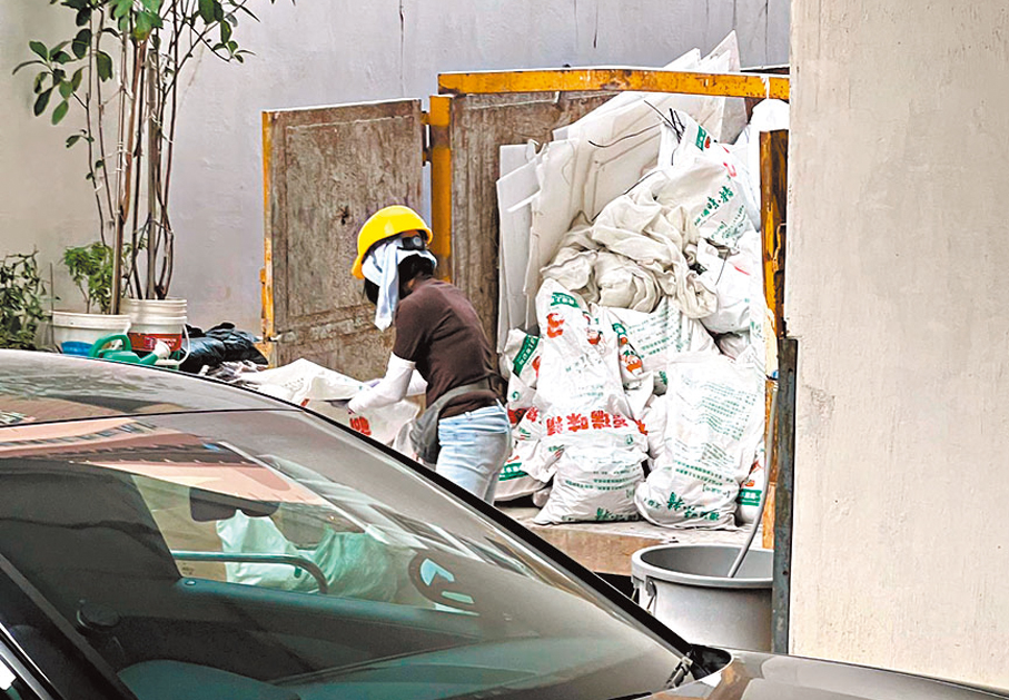 一名頭戴黃色安全帽、身穿反光衣的女工推着一輛滿載灰白色棚網及發泡膠的推車,從光井底部急步走向建築廢料區。記者上前查問是否進行外牆維修,女工即時連連否認,神色慌張。