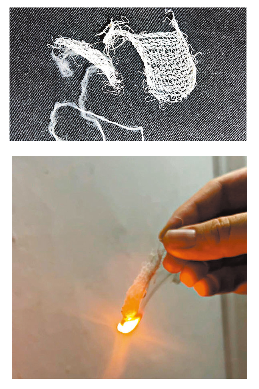 香港文匯報記者隨即撿走剛被棄置的三種物料樣本,包括灰白色棚網主體、棚網縫合位的啡色布邊,以及白色發泡膠,並前往屋苑外安全地點以打火機進行燃燒測試,其間灰白色棚網一觸火即烈焰竄升,冒出濃烈黑煙及刺鼻塑膠味;啡色布邊更是一點即燃,火舌竄升,險些燒傷記者手指;發泡膠則瞬間熔化滴落燃燒塑膠,火星四濺。三種物料均在數秒內猛烈燃燒,完全不具任何阻燃功能。