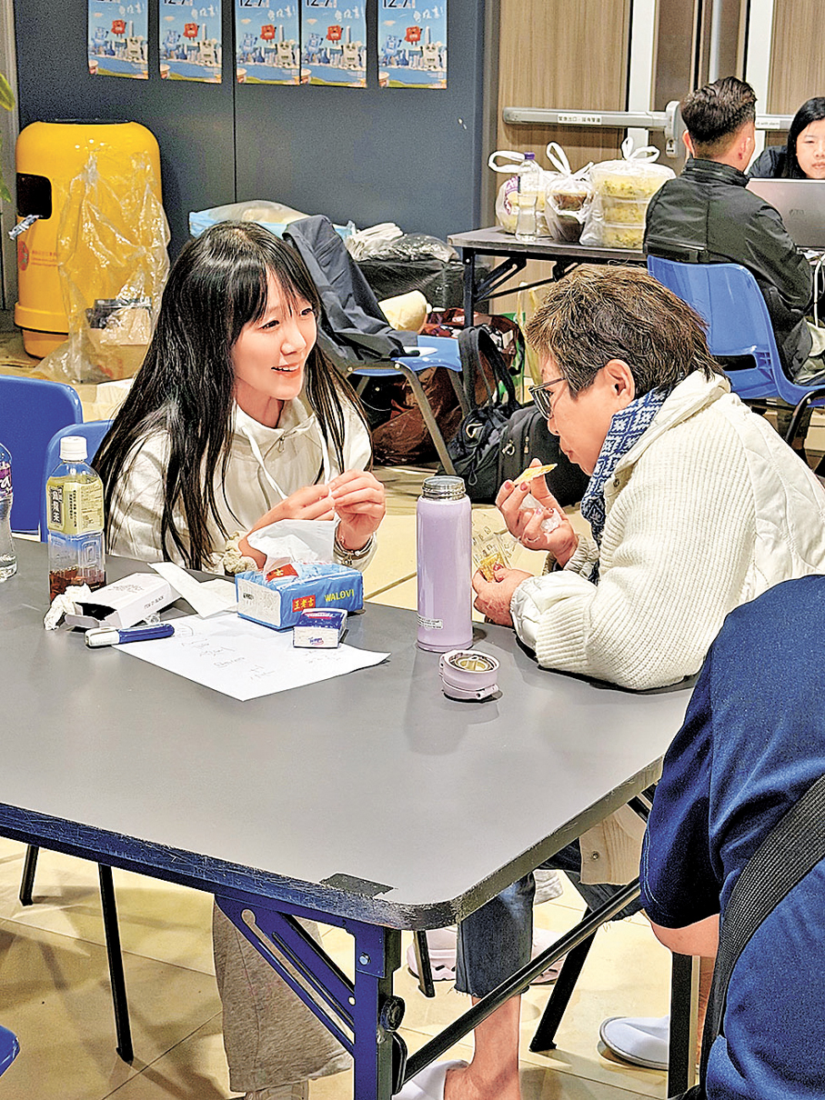 92年出生的鍾靜儀是這20多人隊伍裏唯一女性,在深圳出生、長大,廣東話流利。她敏銳地發現,在東昌街社區會堂臨時庇護中心的多為年長者,他們徹夜難眠,「所以我們的物資送到後並沒有直接離開,男士們幫災民們搬物資、發保暖衣、鋪床墊,我就陪這些老人家聊天。」一位婆婆拉着她手說,還好有人陪聊天,不然一個晚上真的很難熬;還有些長者不願意留在庇護中心,在室外吹着寒風遠遠望着自己正在燃燒的家,「我已經不知道如何安慰,就默默陪伴在他們身邊。」