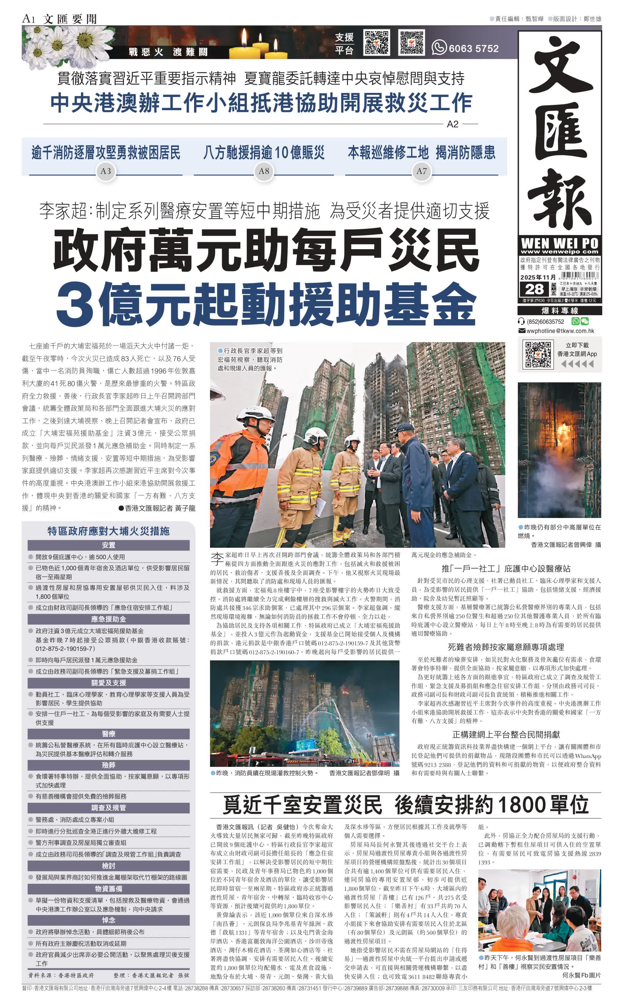 香港文匯報訊(記者 黃子龍)七座逾千戶的大埔宏福苑於一場滔天大火中付諸一炬,截至午夜零時,今次火災已造成83人死亡,以及76人受傷,當中一名消防員殉職,傷亡人數超過1996年佐敦嘉利大廈的41死80傷火警,是歷來最慘重的火警。特區政府全力救援、善後,行政長官李家超昨日上午召開跨部門會議,統籌全體政策局和各部門全面跟進大埔火災的應對工作,之後到達大埔視察,晚上召開記者會宣布,政府已成立「大埔宏福苑援助基金」注資3億元,接受公眾捐款,並向每戶災民派發1萬元應急補助金。同時制定一系列醫療、殮葬、情緒支援、安置等短中期措施,為受影響家庭提供適切支援。李家超再次感謝習近平主席對今次事件的高度重視。中央港澳辦工作小組來港協助開展救援工作,體現中央對香港的關愛和國家「一方有難、八方支援」的精神。