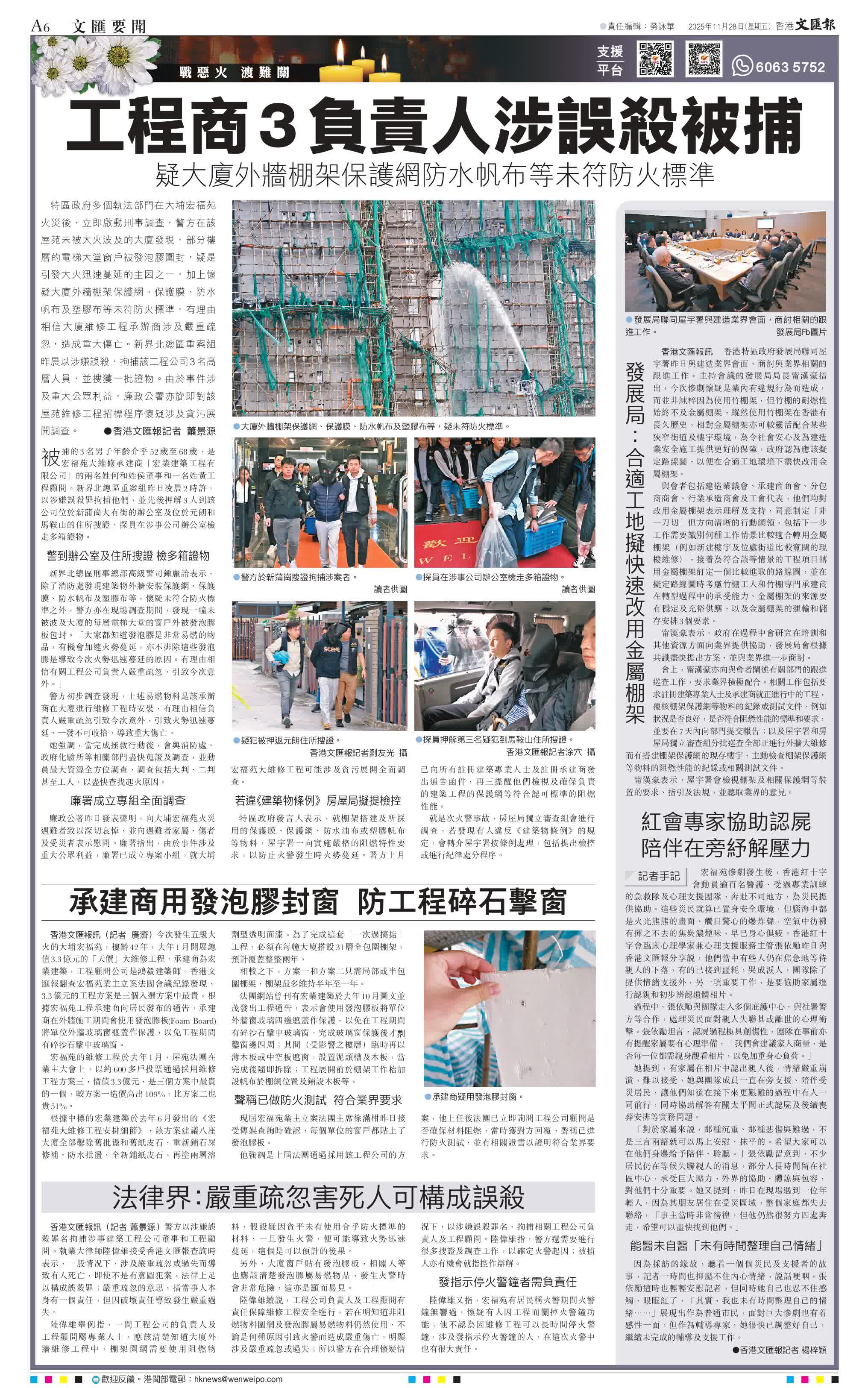 香港文匯報訊(記者 蕭景源)特區政府多個執法部門在大埔宏福苑火災後,立即啟動刑事調查,警方在該屋苑未被大火波及的大廈發現,部分樓層的電梯大堂窗戶被發泡膠圍封,疑是引發大火迅速蔓延的主因之一,加上懷疑大廈外牆棚架保護網、保護膜、防水帆布及塑膠布等未符防火標準,有理由相信大廈維修工程承辦商涉及嚴重疏忽,造成重大傷亡。新界北總區重案組昨晨以涉嫌誤殺,拘捕該工程公司3名高層人員,並搜獲一批證物。由於事件涉及重大公眾利益,廉政公署亦旋即對該屋苑維修工程招標程序懷疑涉及貪污展開調查。