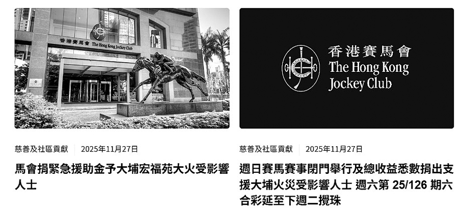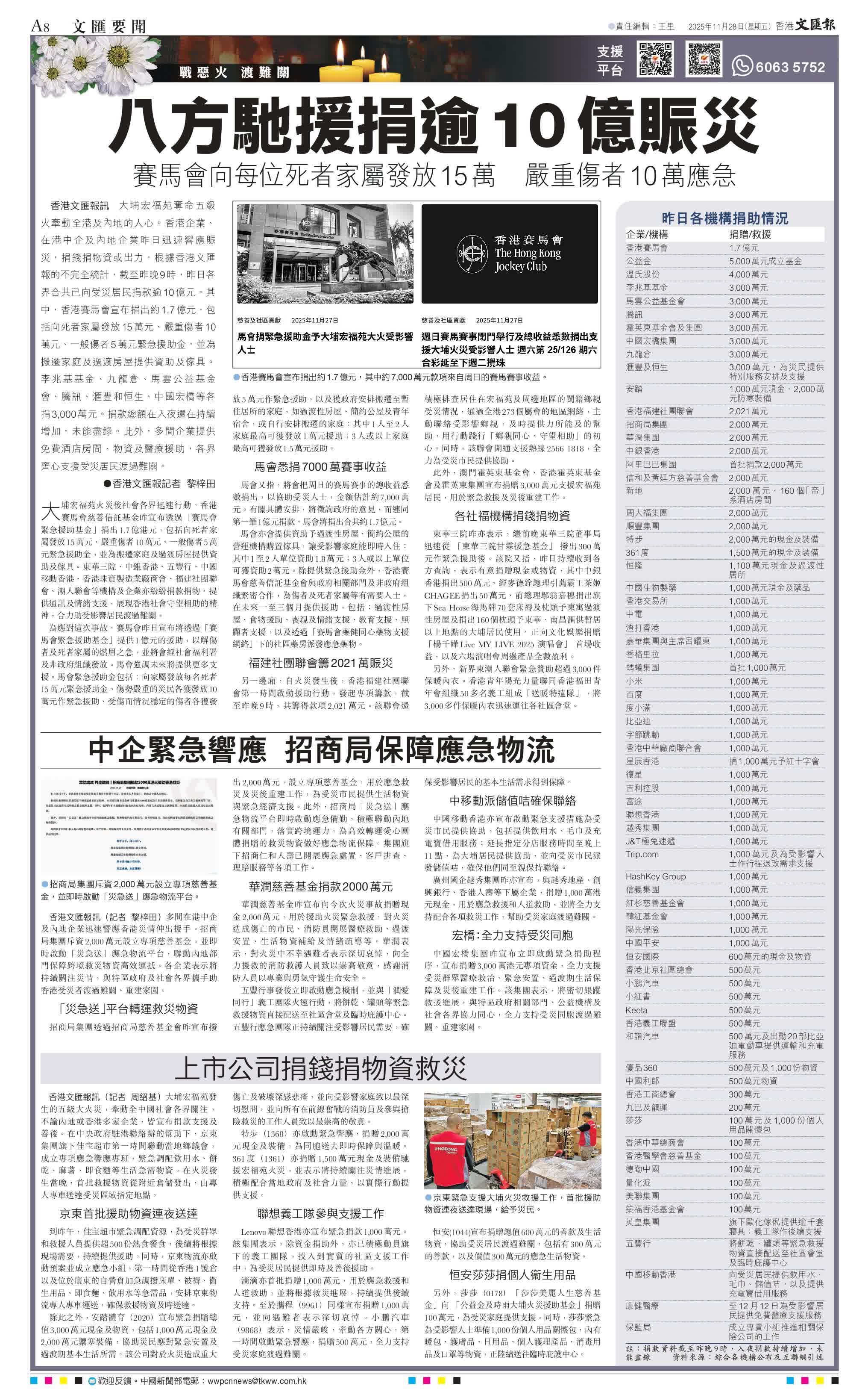 大埔宏福苑火災後社會各界迅速行動。香港賽馬會慈善信託基金昨宣布透過「賽馬會緊急援助基金」捐出1.7億港元,包括向死者家屬發放15萬元、嚴重傷者10萬元、一般傷者5萬元緊急援助金,並為搬遷家庭及過渡房屋提供資助及傢具。東華三院、中銀香港、五豐行、中國移動香港、香港珠寶製造業廠商會、福建社團聯會、潮人聯會等機構及企業亦紛紛捐款捐物、提供通訊及情緒支援,展現香港社會守望相助的精神,合力助受影響居民渡過難關。