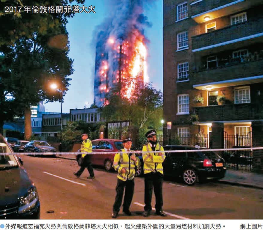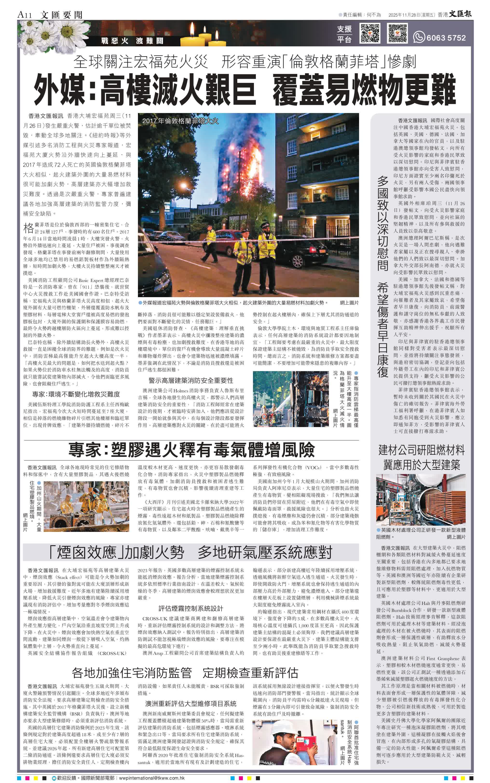 香港文匯報訊 香港大埔宏福苑周三(11月26日)發生嚴重火警,估計逾千單位被焚毀,牽動全球多地關注。《紐約時報》等外媒引述多名消防工程與火災專家報道,宏福苑大廈火勢沿外牆快速向上蔓延,與2017年造成72人死亡的英國倫敦格蘭菲塔大火相似,起火建築外圍的大量易燃材料很可能加劇火勢,高層建築亦大幅增加救災難度。透過是次嚴重火警,專家普遍建議各地加強高層建築的消防監管力度,彌補安全缺陷。