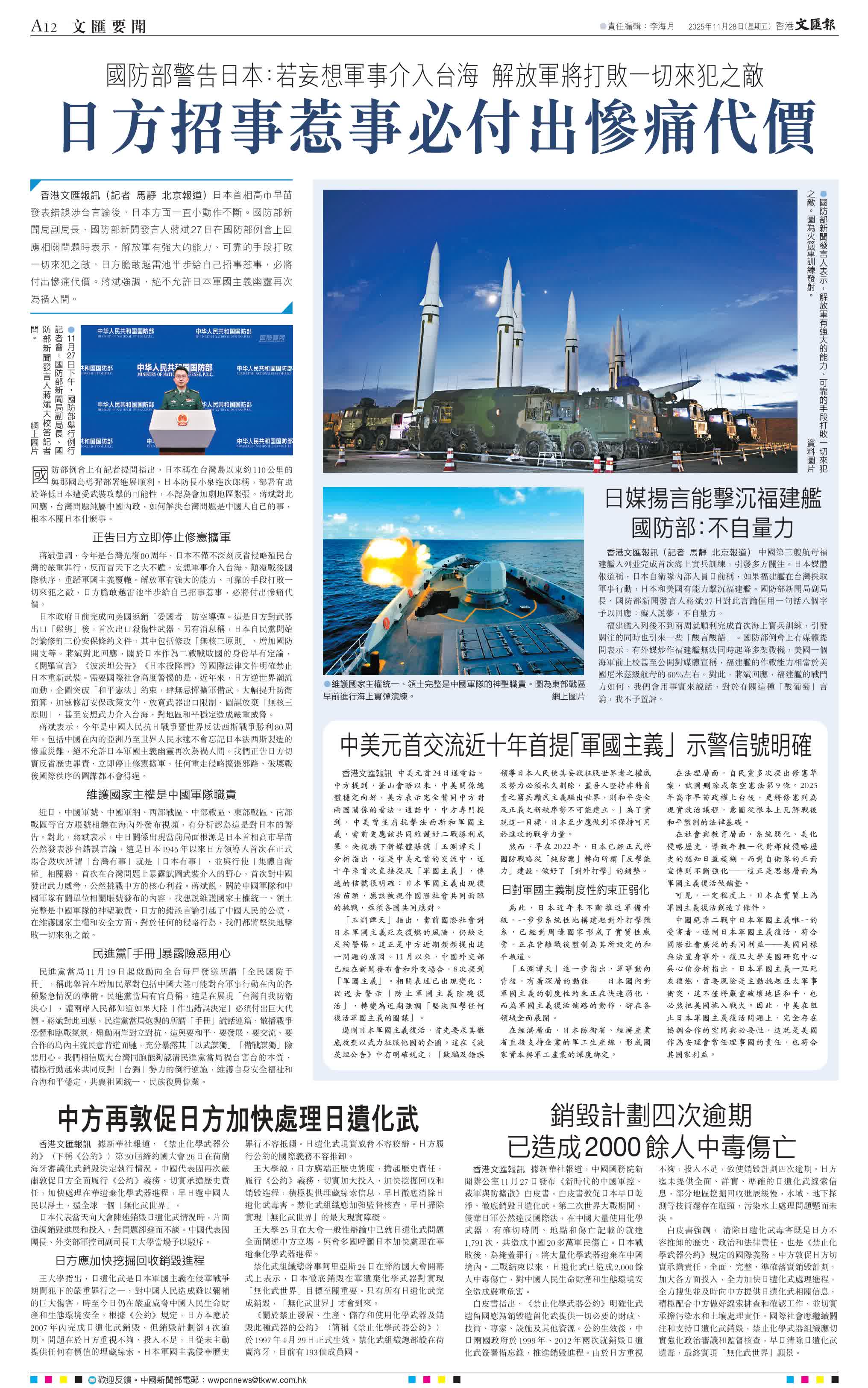 蔣斌強調,今年是台灣光復80周年,日本不僅不深刻反省侵略殖民台灣的嚴重罪行,反而冒天下之大不韙,妄想軍事介入台海,顛覆戰後國際秩序,重蹈軍國主義覆轍。解放軍有強大的能力、可靠的手段打敗一切來犯之敵,日方膽敢越雷池半步給自己招事惹事,必將付出慘痛代價。