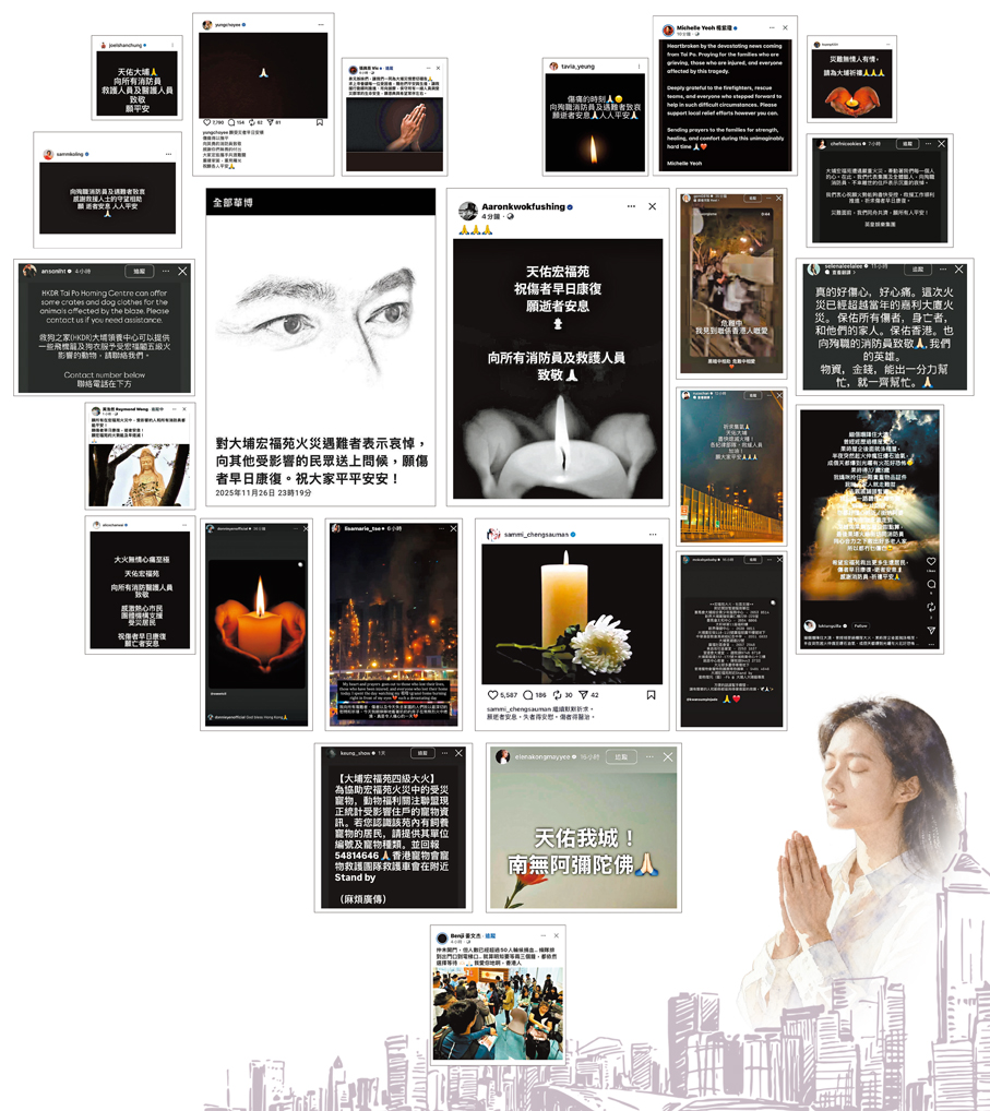 劉德華在「華仔天地」網站上留言:「對大埔宏福苑火災遇難者表示哀悼,向其他受影響的民眾送上問候,願傷者早日康復。祝大家平平安安!」郭富城在社交平台留言:「天佑宏福苑!祝傷者早日康復,願逝者安息,向所有消防員及救護人員致敬」。甄子丹在Ig限時動態貼出燭光照留言:「God Bless Hong Kong(天祐香港)!」。
