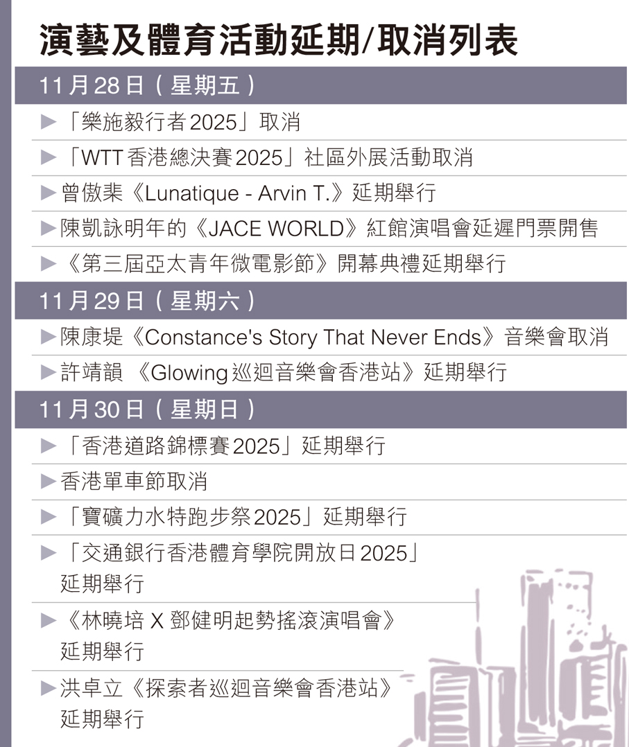 楊千嬅明日(29日)在紅館展開一連六場演唱會,千嬅與團隊表示因檔期與製作限制無法調整,幾經思量,演唱會將如期舉行,但調整了3項安排,包括取消贈送花籃、捐贈首場收益及周邊產品所有盈利、以及調整演出內容。韓國頒獎禮MAMA於28及29日在香港啟德體育園主場館如期舉行。主辦方稱為表哀悼,將於活動上舉行默哀儀式,並作出捐款支持受影響家庭,以「支持香港」作為活動主調,為香港提供正能量。