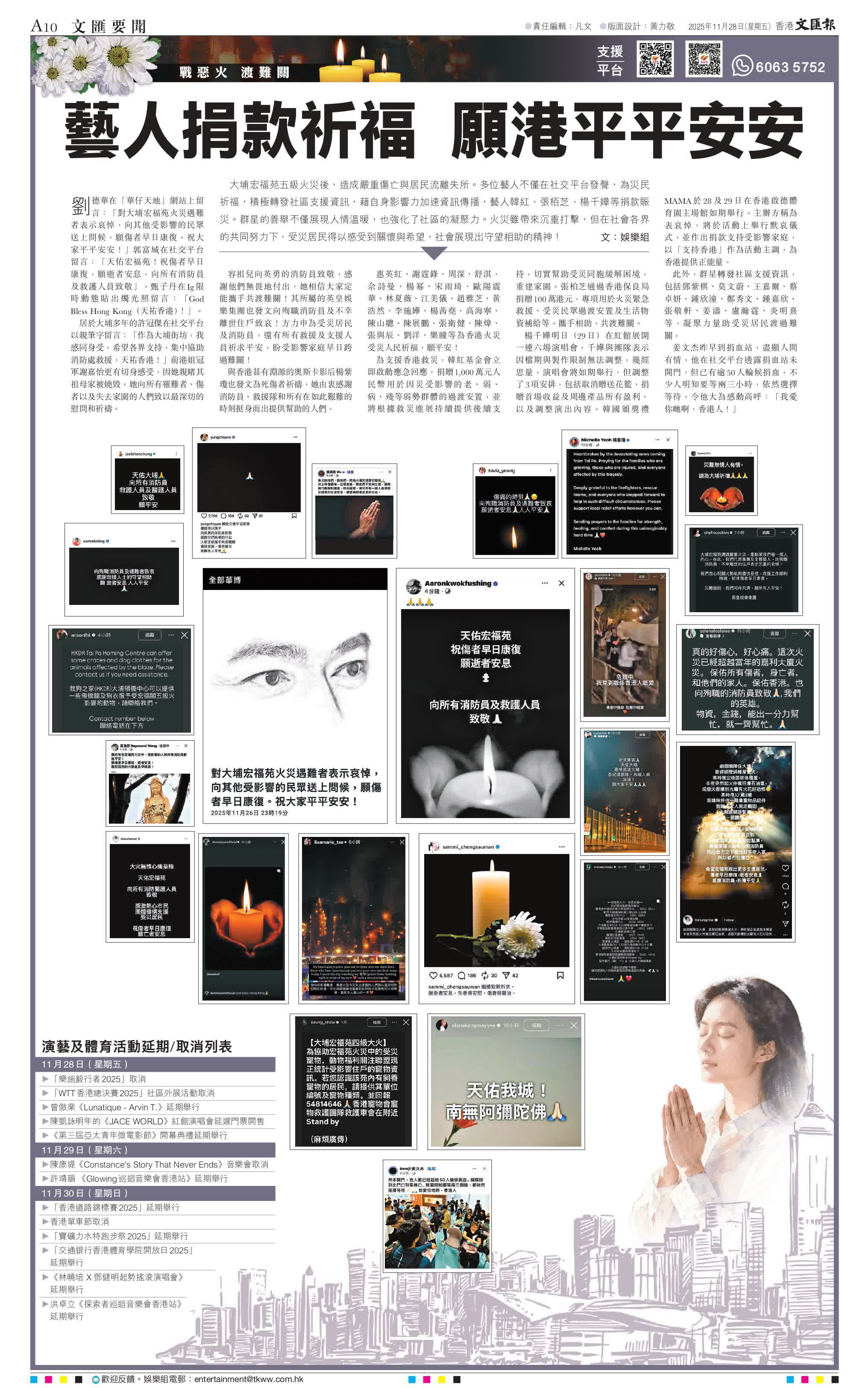 (香港文匯報娛樂組)大埔宏福苑五級火災後,造成嚴重傷亡與居民流離失所。多位藝人不僅在社交平台發聲,為災民祈福,積極轉發社區支援資訊,藉自身影響力加速資訊傳播,藝人韓紅、張栢芝、楊千嬅等捐款賑災。群星的善舉不僅展現人情溫暖,也強化了社區的凝聚力。火災雖帶來沉重打擊,但在社會各界的共同努力下,受災居民得以感受到關懷與希望,社會展現出守望相助的精神!