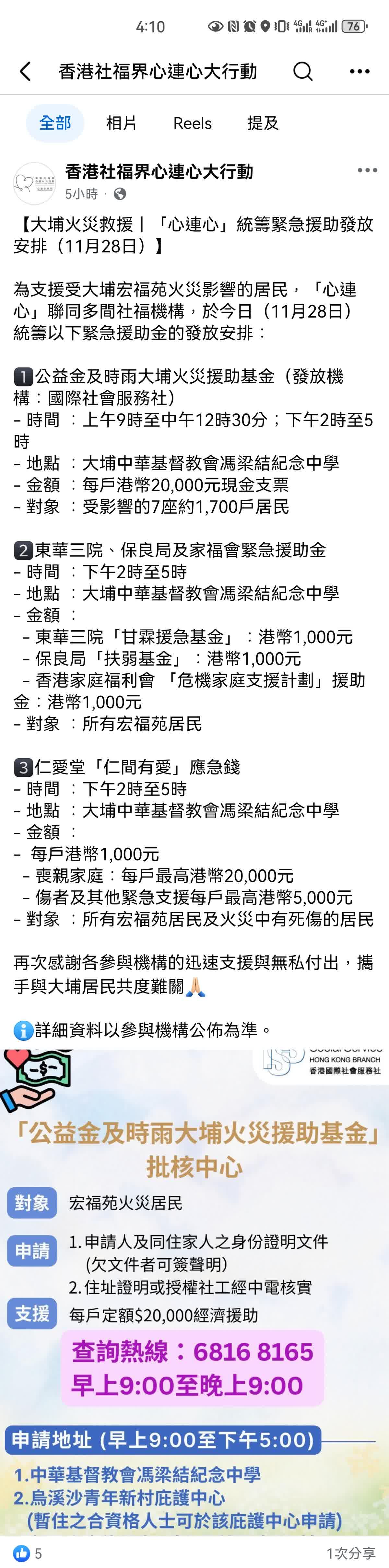 為支援受大埔宏福苑火災影響的居民,「心連心」聯同多間社福機構,於今日(28日)统籌以下緊急援助金的發放安排:「公益金及時雨大埔火災救援基金」為受影響的7棟樓約1700戶居民提供每戶2萬港元現金支票;東華三院、保良局、香港家庭福利會分別為全體宏福苑居民提供每戶1000港元緊急救援金。上述資金由香港社福界心連心大行動自11月28日起統籌發放。