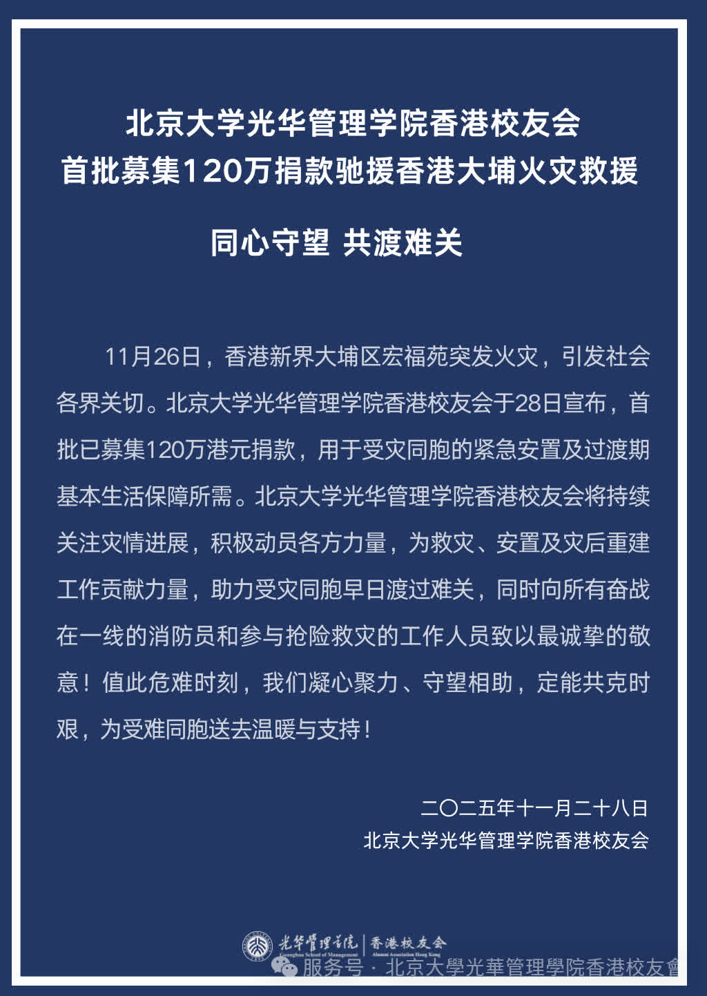 11月26日,香港新界大埔區宏福苑突發火災,引發社會各界關切。北京大學光華管理學院香港校友會於28日宣布,首批已募集120萬港元捐款,用於受災同胞的緊急安置及過渡期基本生活保障所需。
