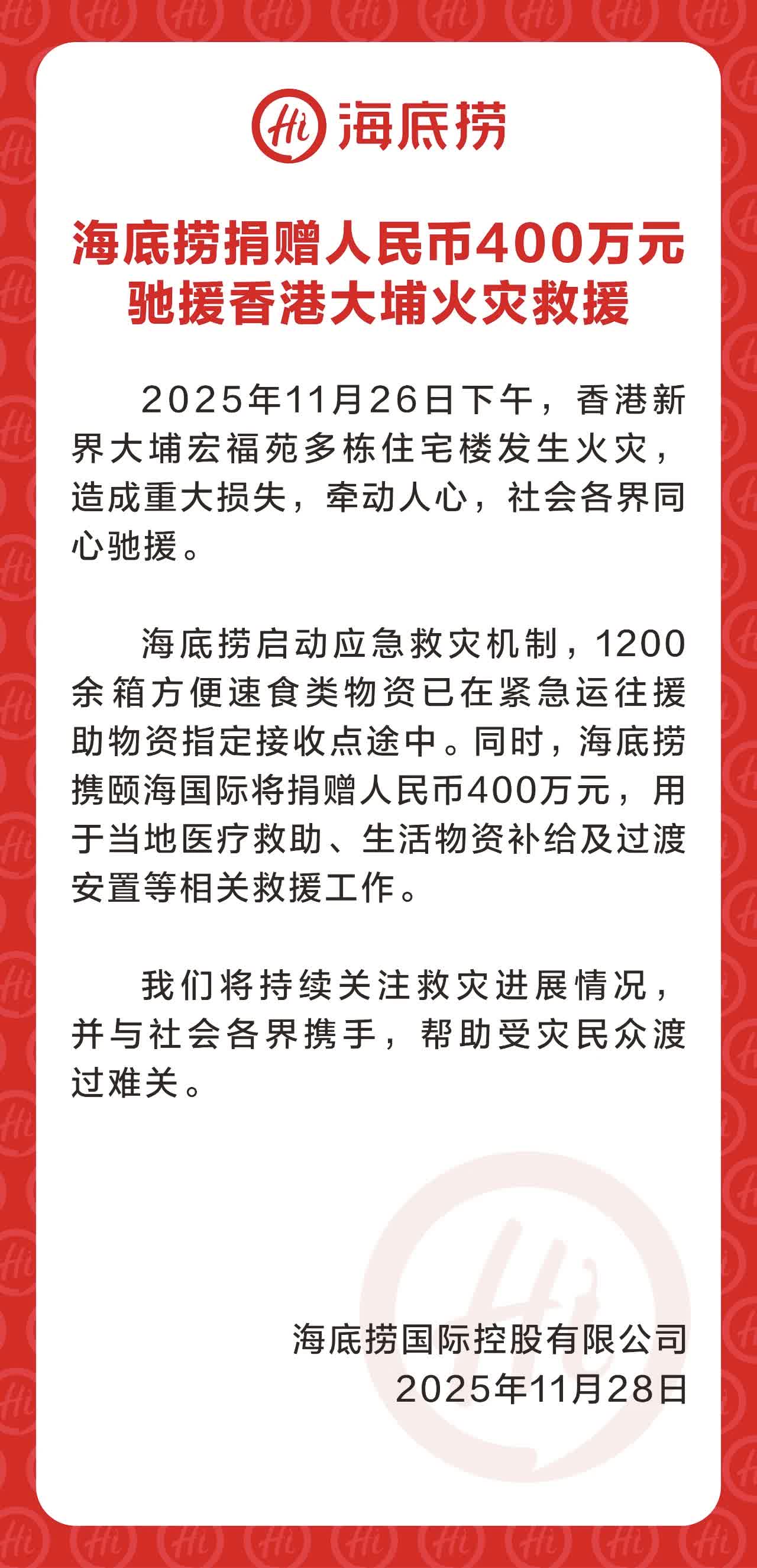 (香港文匯網記者李薇)2025年11月26日下午,香港新界大埔宏福苑多棟住宅樓突發火災,造成重大損失。火災發生後,社會各界迅速展開救援行動,知名餐飲品牌海底撈也第一時間啟動應急救災機制,積極履行社會責任。