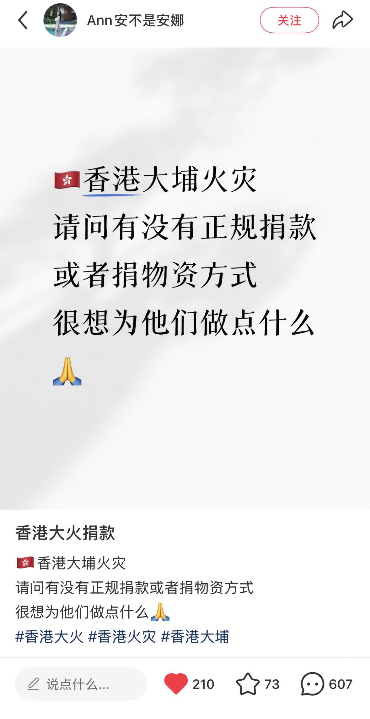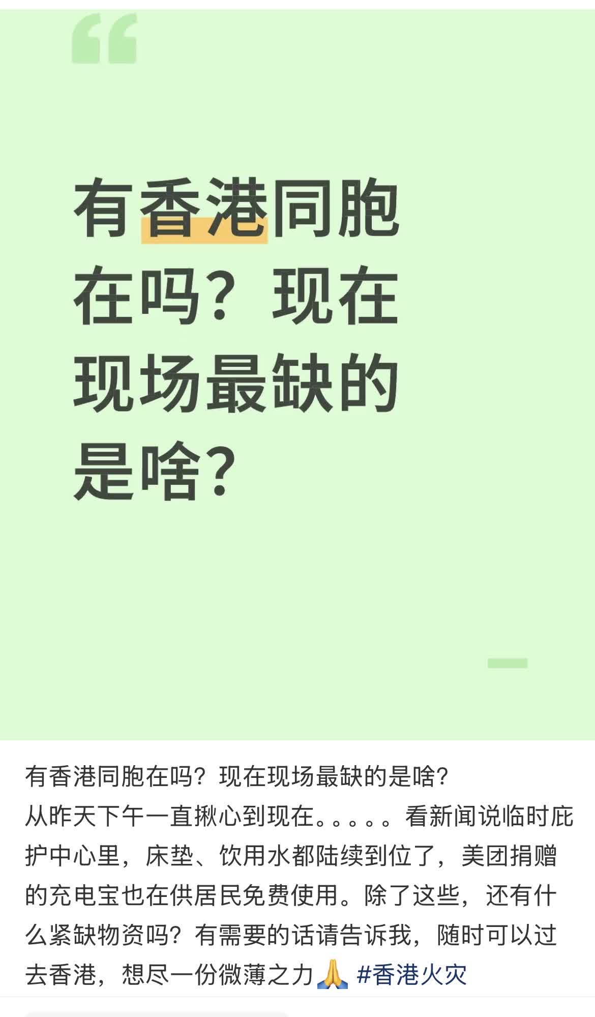(香港文匯網記者盧靜怡 廣州報道)「尋找給香港捐款的官方渠道,很想為他們做點什麼」「我想為香港捐款,可以怎麼做?」「有香港同胞嗎?你們現在最缺什麼?」香港大埔宏福苑發生大火的消息,連日來持續牽動着內地民眾的心,各類飽含牽掛的聲援帖文,在內地社交網絡上不斷湧現。災情發生後,內地網友的愛心迅速凝聚,大家紛紛主動探尋捐贈渠道,用實際行動支援香港。