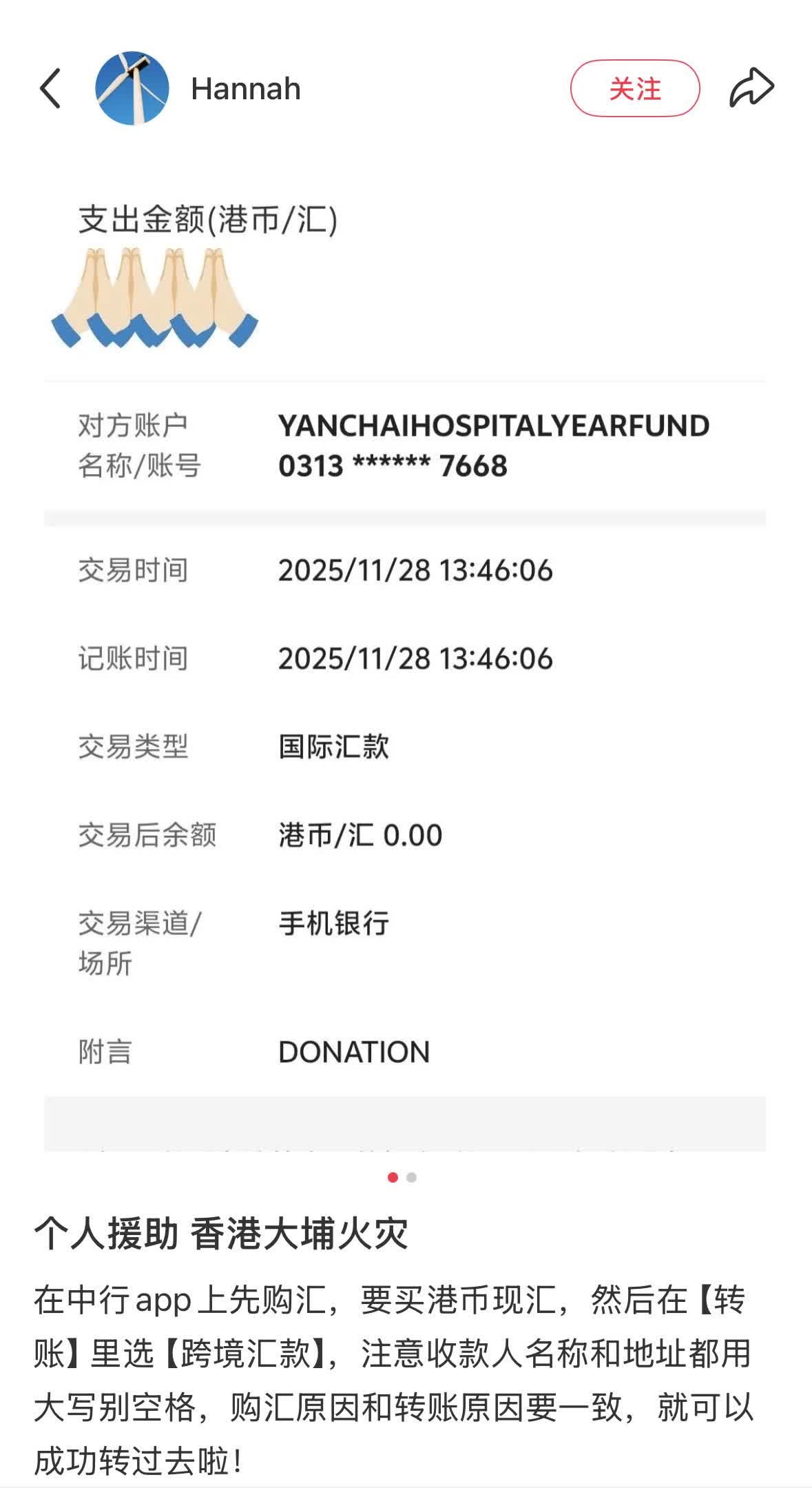 與香港一衣帶水的廣東,民眾對香港災情的牽掛格外深切。廣東網友「淼森」形容自己「把所有方法都試了一遍」,從更換港幣到查SWIFT碼,最終無法線上辦理外匯,只好轉向香港紅十字會,以雲閃付成功完成捐款。而廣東網民「寶木美文」清晨便去兌換港幣,嘗試以中行賬戶跨境匯款,卻因操作流程不熟悉,折騰到下午才最終完成心愿。廣州網民「縱你」則一直關注災情新聞。他留言:「從看到(大火)開始就揪心,不知香港現在最缺什麼。如果需要,我隨時可以過去香港,想盡一點綿薄之力。」