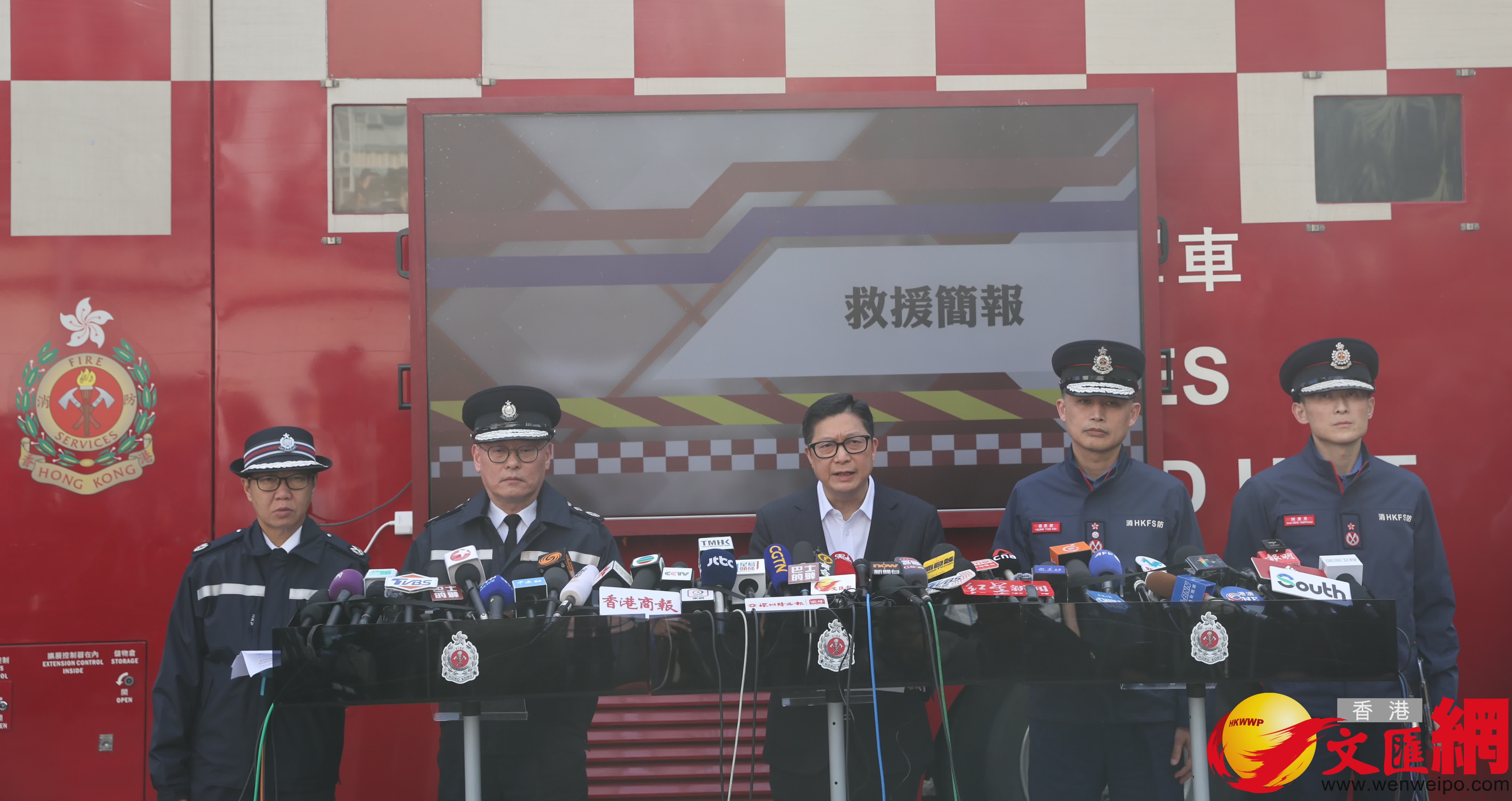 11月28日下午,香港保安局、消防處、警務處聯合召開傳媒見面會,發布大埔5級火警救援和調查進展。
