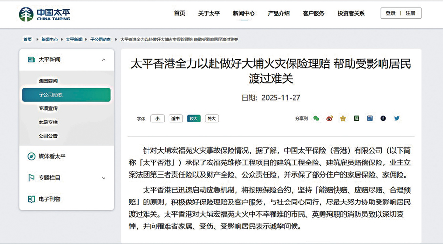 在中國太平保險官網,太平香港公告稱,該公司承保了宏福苑維修工程項目的建築工程全險、建築僱員賠償保險,業主立案法團第三者責任險以及財產全險、公衆責任險,並承保了部分住戶的家居保險、家傭險。針對宏福苑火災事故保險情況,該公司已迅速啟動應急機制,將按照保險合約,堅持「能賠快賠、應賠盡賠、合理預賠」的原則,積極做好保險理賠及客戶服務,與社會同心同行,盡最大努力協助受影響居民渡過難關。太平香港對大埔宏福苑大火中不幸罹難的市民、英勇殉職的消防員致以深切哀悼,並向罹難者家屬,受傷、受影響居民表示誠摯問候。