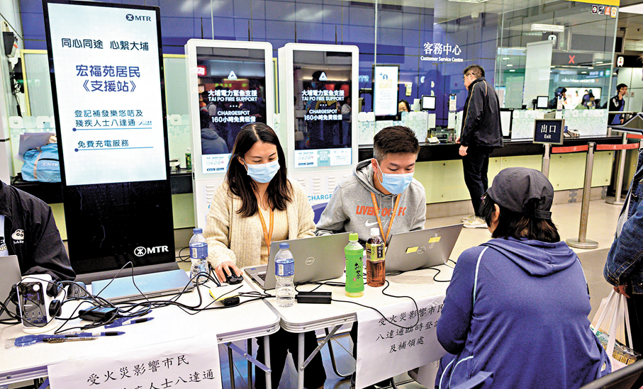 港鐵表示,對大埔宏福苑火災極度哀痛,對火警中離世、受傷,以及痛失家園和至親的人士,致以深切慰問。港鐵會配合政府緊急支援及募捐工作組安排,並且於大埔墟港鐵站設立支援站,為受影響居民特快補領登記樂悠咭、「殘疾人士身份」個人八達通,以及「學生身份」個人八達通,又會免費借出流動充電器,供有需要的人士使用。