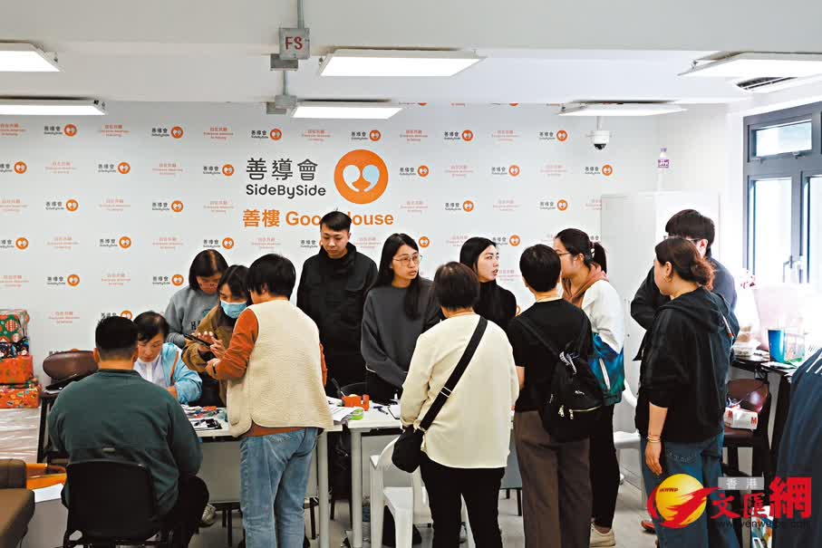 記者隨後前往附近的「善樓」直擊,現場有多名關愛隊隊員來來往往為宏福苑居民張羅,部分隊員則與災民聊天了解狀況及需要,其他職員及義工則忙於整理物資及派發飯盒,現場繁忙有序。項目營運機構善導會項目經理蘇凱君表示,最後一個可提供的單位已分派完,共有160個單位提供予近300名宏福苑居民入住,約佔總單位數量60%。機構設立社工資訊站,由社工為受影響居民提供支援,主要是精神層面的支持,以及協助梳理資訊、解答疑問等,有需要會轉介至相關部門跟進。