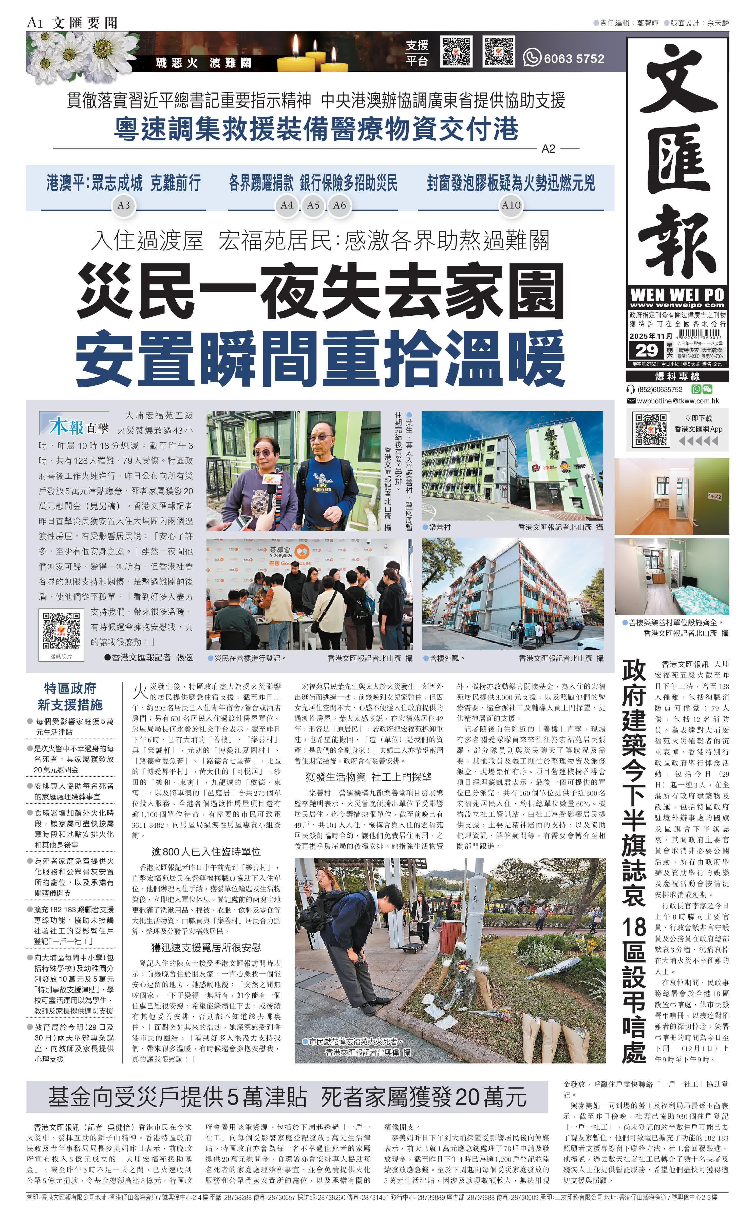 (香港文匯報記者 張弦)大埔宏福苑五級火災焚燒超過43小時,昨晨10時18分熄滅。截至昨午3時,共有128人罹難、79人受傷。特區政府善後工作火速進行,昨日公布向所有災戶發放5萬元津貼應急,死者家屬獲發20萬元慰問金。香港文匯報記者昨日直擊災民獲安置入住大埔區內兩個過渡性房屋,有受影響居民說:「安心了許多,至少有個安身之處。」雖然一夜間他們無家可歸,變得一無所有,但香港社會各界的無限支持和關懷,是熬過難關的後盾,使他們從不孤單,「看到好多人盡力支持我們,帶來很多溫暖,有時候還會擁抱安慰我,真的讓我很感動!」