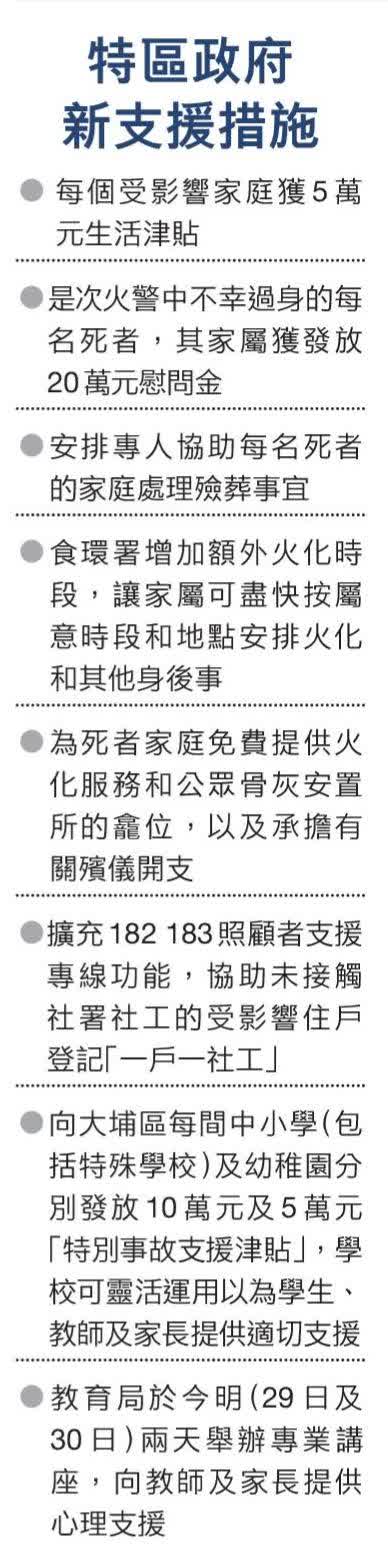(香港文匯報記者 吳健怡)香港市民在今次火災中,發揮互助的獅子山精神。香港特區政府民政及青年事務局局長麥美娟昨日表示,前晚政府宣布投入3億元成立的「大埔宏福苑援助基金」,截至昨午5時不足一天之間,已火速收到公眾5億元捐款,令基金總額高達8億元。特區政府會善用該筆資源,包括於下周起透過「一戶一社工」向每個受影響家庭登記發放5萬元生活津貼。特區政府亦會為每一名不幸過世死者的家屬提供20萬元慰問金,食環署亦會安排專人協助每名死者的家庭處理殮葬事宜,並會免費提供火化服務和公眾骨灰安置所的龕位,以及承擔有關的殯儀開支。