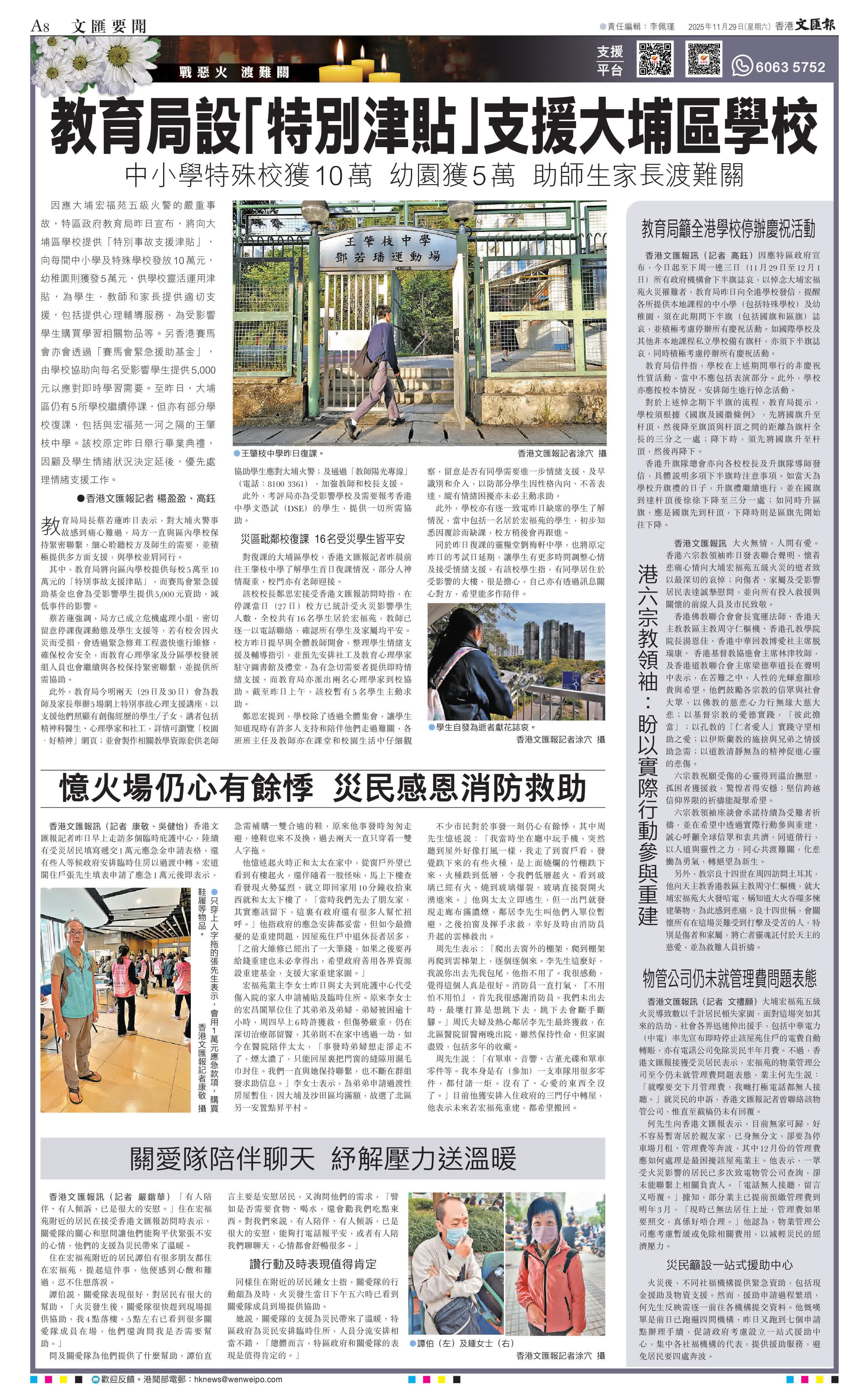 他憶述起火時正和太太在家中,從窗戶外望已看到有樓起火,還伴隨着一股怪味,馬上下樓查看發現火勢猛烈,就立即回家用10分鐘收拾東西就和太太下樓了,「當時我們先去了朋友家,其實應該留下,這裏有政府還有很多人幫忙招呼。」他指政府的應急安排都妥當,但如今最擔憂的是重建問題,因屋苑住戶中退休長者居多,「之前大維修已經出了一大筆錢,如果之後要再給錢重建也未必拿得出,希望政府善用各界資源設重建基金,支援大家重建家園。」