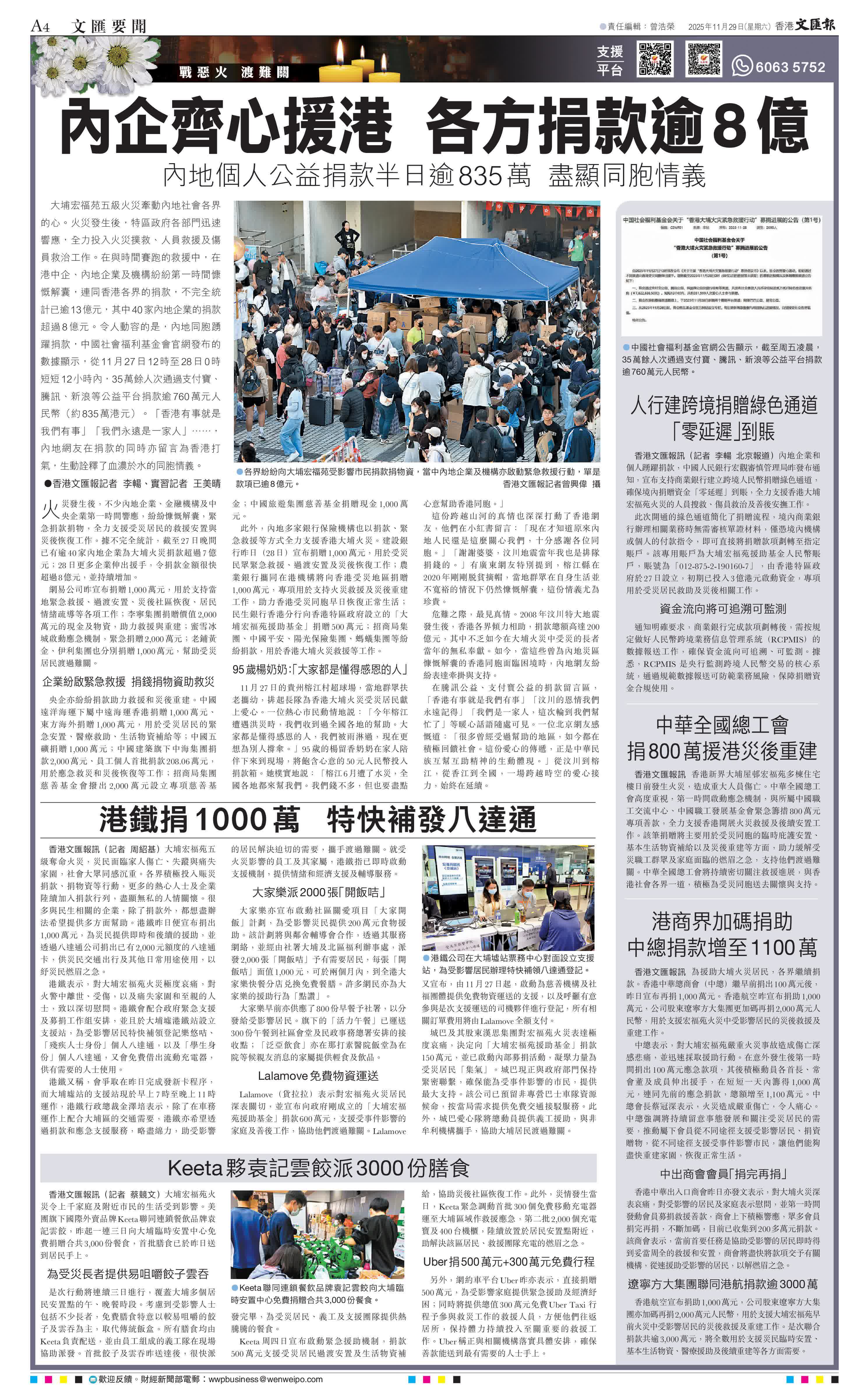 (香港文匯報記者 李暢、實習記者 王美晴)大埔宏福苑五級火災牽動內地社會各界的心。火災發生後,特區政府各部門迅速響應,全力投入火災撲救、人員救援及傷員救治工作。在與時間賽跑的救援中,在港中企、內地企業及機構紛紛第一時間慷慨解囊,連同香港各界的捐款,不完全統計已逾13億元,其中40家內地企業的捐款超過8億元。令人動容的是,內地同胞踴躍捐款,中國社會福利基金會官網發布的數據顯示,從11月27日12時至28日0時短短12小時內,35萬餘人次通過支付寶、騰訊、新浪等公益平台捐款逾760萬元人民幣(約835萬港元)。「香港有事就是我們有事」「我們永遠是一家人」……,內地網友在捐款的同時亦留言為香港打氣,生動詮釋了血濃於水的同胞情義。