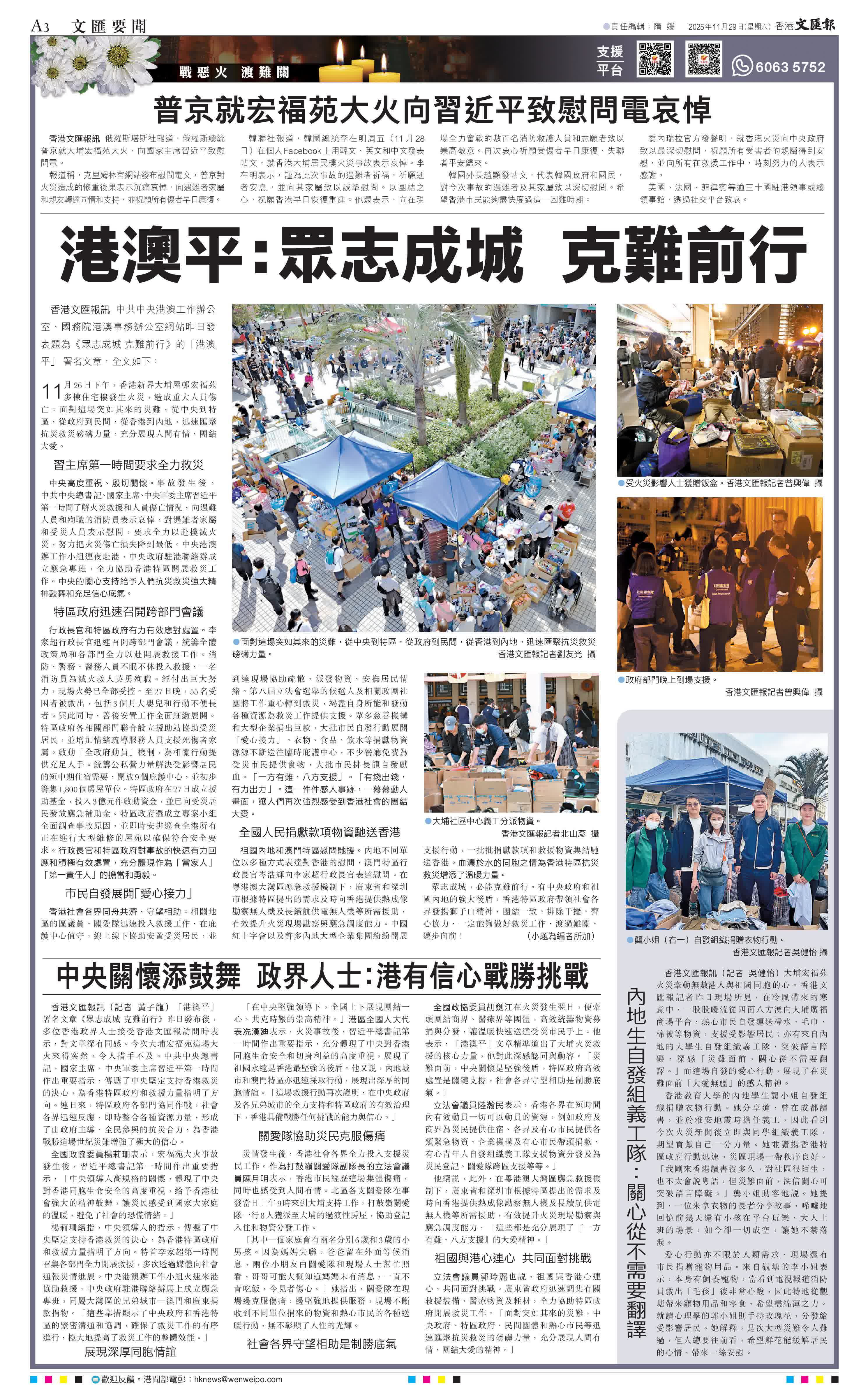 (香港文匯報記者 吳健怡)大埔宏福苑火災牽動無數港人與祖國同胞的心。香港文匯報記者昨日現場所見,在冷風帶來的寒意中,一股股暖流從四面八方湧向大埔廣福商場平台,熱心市民自發運送糧水、毛巾、棉被等物資,支援受影響居民;亦有來自內地的大學生自發組織義工隊,突破語言障礙,深感「災難面前,關心從不需要翻譯。」而這場自發的愛心行動,展現了在災難面前「大愛無疆」的感人精神。