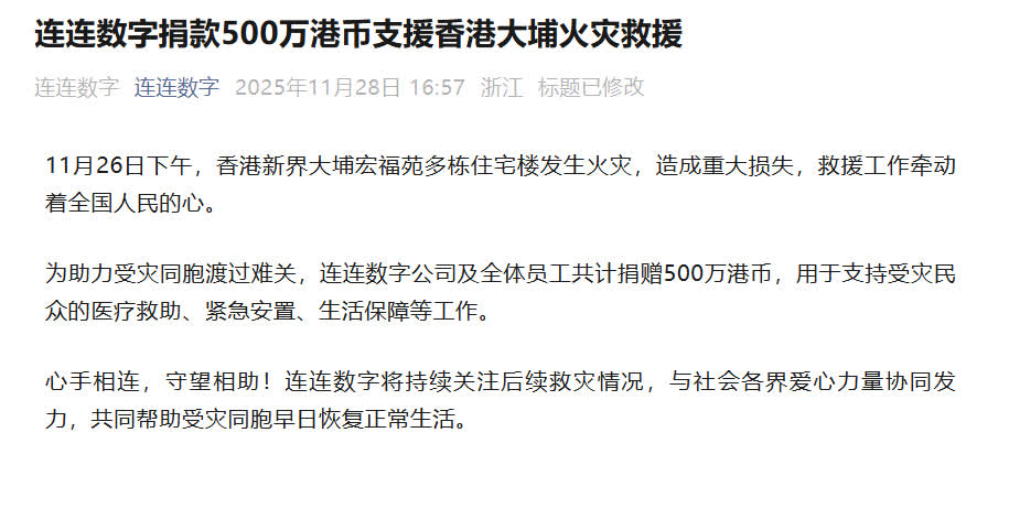 (香港文匯網記者王莉)11月26日下午,香港新界大埔宏福苑多棟住宅樓發生火災,造成重大損失,救援工作牽動着社會各界的心。為助力受災同胞渡過難關,連連數字公司及全體員工共計捐贈500萬港幣,用於支援受災民眾的醫療救助、緊急安置、生活保障等工作。