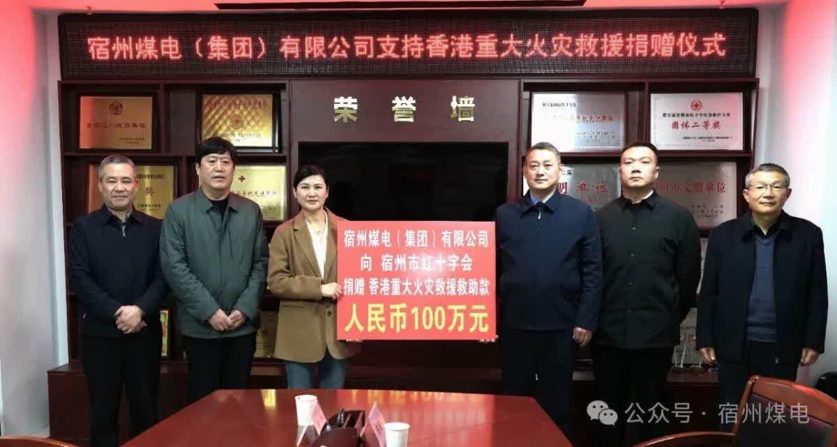 11月28日,捐助款通過中國紅十字會總會迅速到達香港災區。宿州市紅十字會為集團公司舉行了捐贈儀式,宿州煤電黨委副書記房孝虎受李士傑董事長委託,代表宿州煤電全體員工向香港大埔區宏福苑受火災的同胞們捐贈100萬元人民幣。他表示:「香港與內地血脈相連,同胞有難,我們責無旁貸。」他續說,宿州煤電作為宿州市的優秀民營企業代表,始終秉持財富「取之社會、用之社會」的理念,在企業發展的同時,從未忘記社會責任,積極投身公益慈善事業,以實際行動詮釋着企業的擔當與愛心。希望通過捐款,在香港特區政府和社會各界的共同努力下,受災同胞一定能早日渡過難關、重建家園。