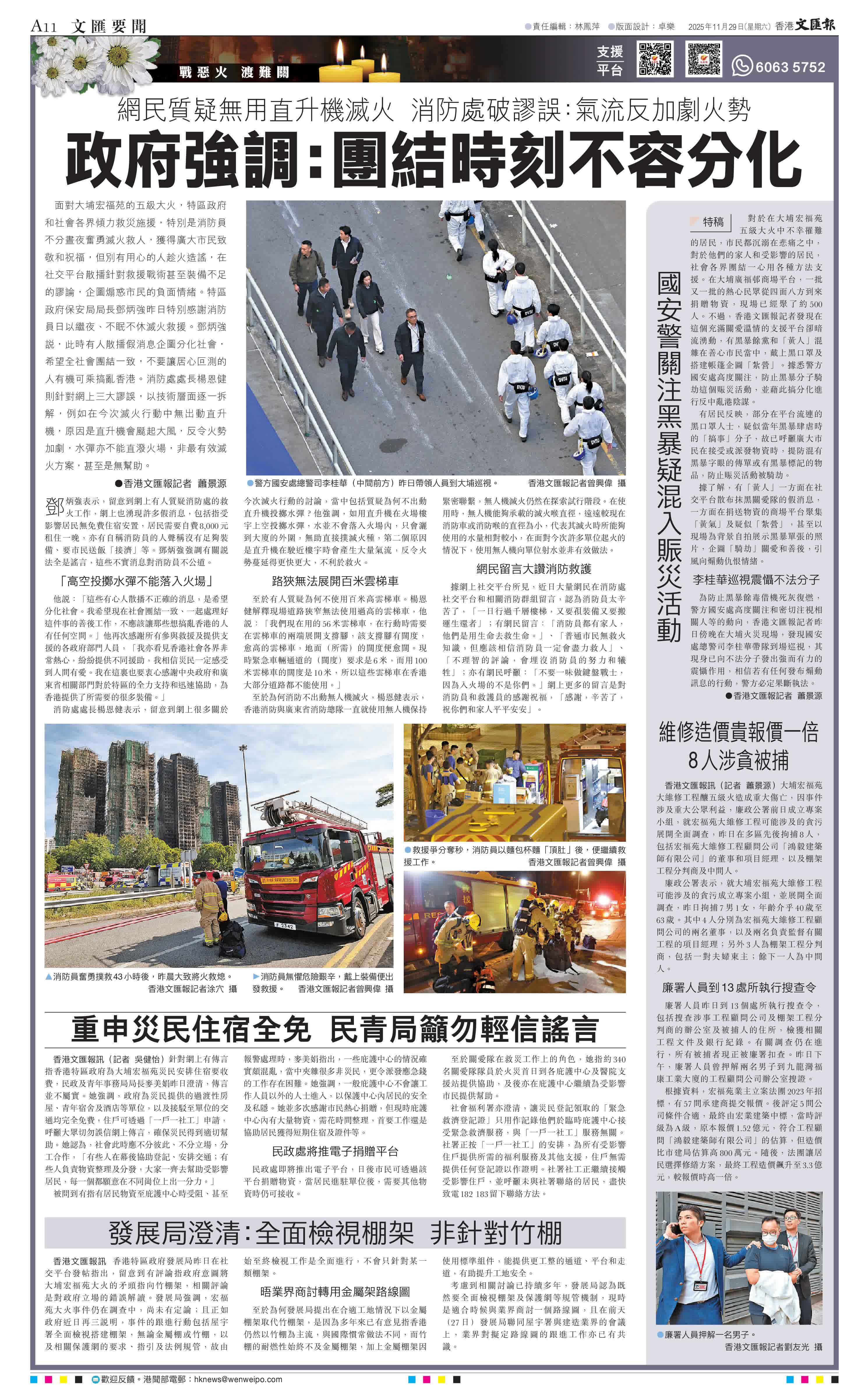 (香港文匯報記者 蕭景源)面對大埔宏福苑的五級大火,特區政府和社會各界傾力救災施援,特別是消防員不分晝夜奮勇滅火救人,獲得廣大市民致敬和祝福,但別有用心的人趁火造謠,在社交平台散播針對救援戰術甚至裝備不足的謬論,企圖煽惑市民的負面情緒。特區政府保安局局長鄧炳強昨日特別感謝消防員日以繼夜、不眠不休滅火救援。鄧炳強說,此時有人散播假消息企圖分化社會,希望全社會團結一致,不要讓居心叵測的人有機可乘搞亂香港。消防處處長楊恩健則針對網上三大謬誤,以技術層面逐一拆解,例如在今次滅火行動中無出動直升機,原因是直升機會颳起大風,反令火勢加劇,水彈亦不能直潑火場,非最有效滅火方案,甚至是無幫助。