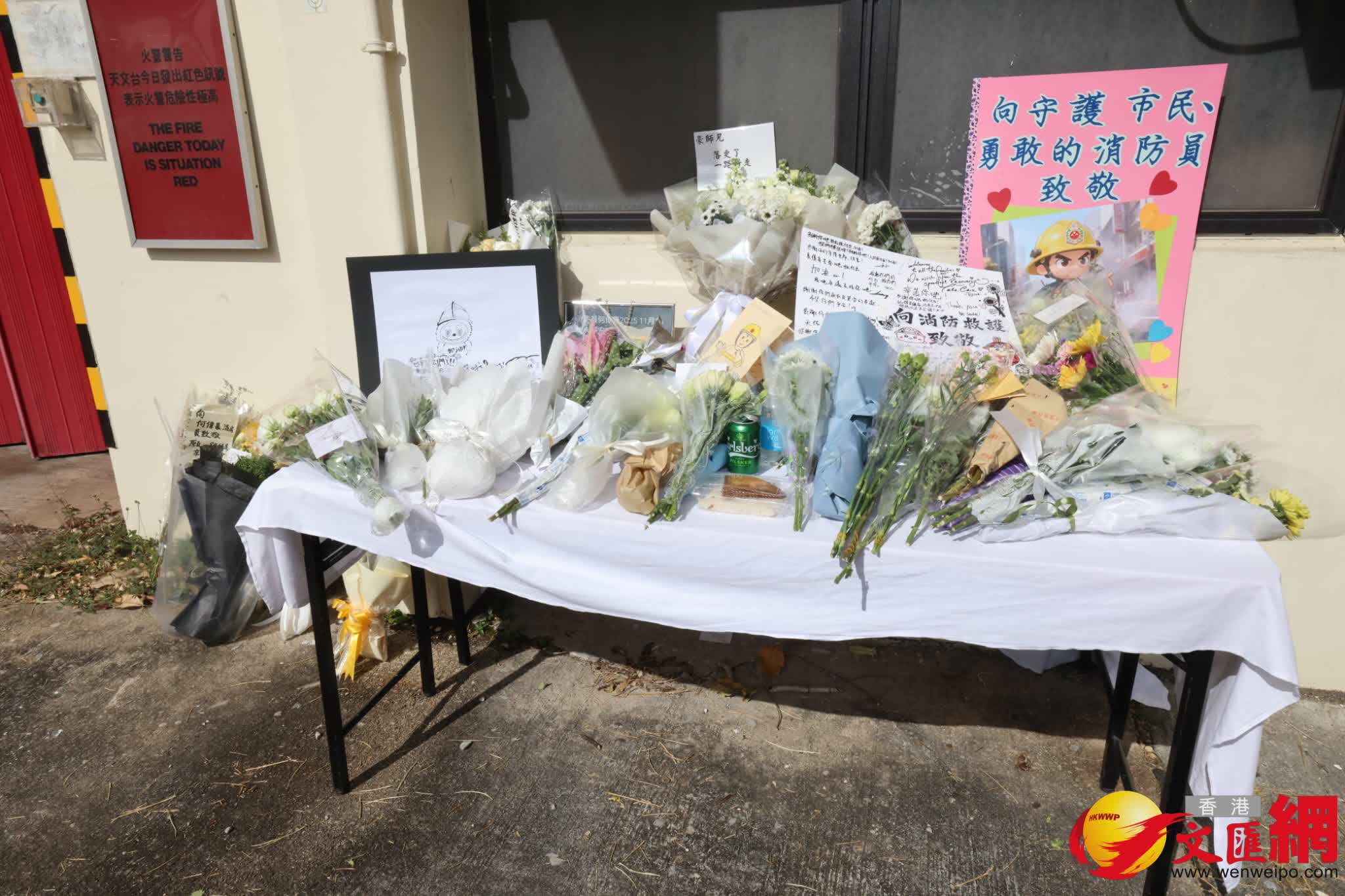 香港文匯報訊(記者 蕭景源)大埔宏福苑本周三(26日)發生五級火警,造成多人死傷,其中消防員何偉豪英勇殉職。今日(29日)早上8時,何偉豪生前駐守的沙田消防局下半旗誌哀及舉行默哀儀式;而消防局外設有舖上白布的檯讓市民擺放鮮花及心意卡悼念,但見檯面擺滿鮮花、心意卡及祭品,有市民需要將鮮花置放檯邊地上,有心意卡寫著「願一路好走,辛苦你了」、「向守護市民、勇敢的消防員致敬」字句。