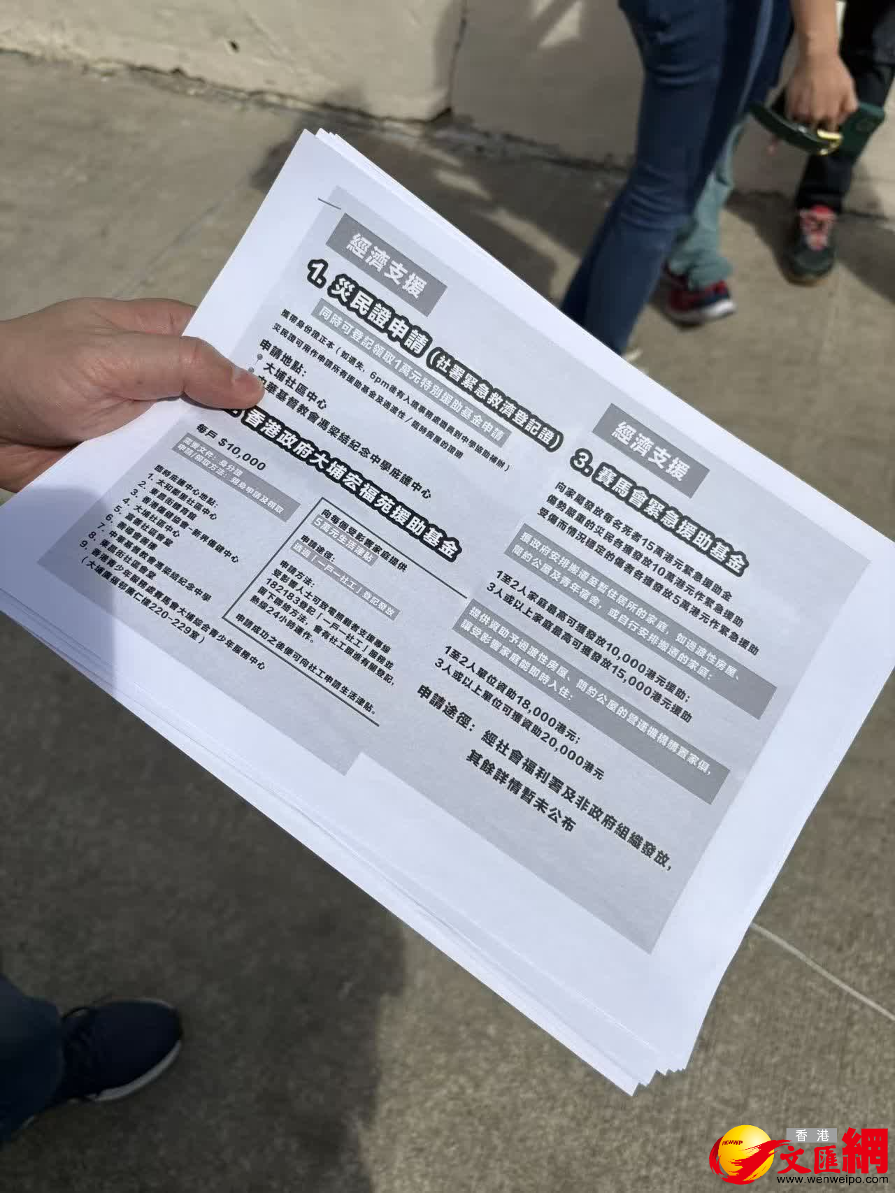 香港心理衞生會工作人員盧先生向香港文匯報表示,前幾天受影響居民諮詢的內容九成以上集中在住宿安排、證件補辦、資金補助等問題上,情緒支援需求相對較少。他觀察到不少居民由於求援信息過多、過於混亂,並無統一最新版本而感到困惑,因此香港心理衞生會特地整理了一批信息印發給在場居民,「盡量讓街坊第一時間得知手續如何申請與辦理。」