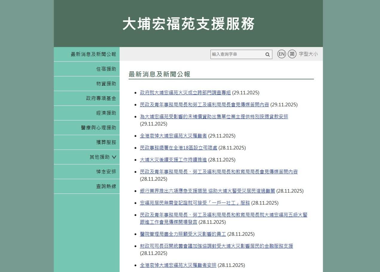 香港文匯報訊(記者 蕭景源)政府正式推出「大埔宏福苑支援服務」專題網站,網站內提供包括住宿支援、物資援助、政府專項基金、經濟援助、醫療與心理支援、殯葬服務、法律支援、證件申請及延長逗留期限、動物援助、悼念安排和查詢熱線等相關資訊及最新消息,以便市民查閱。