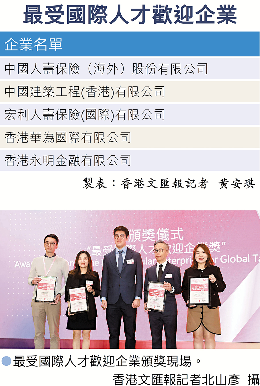 同場亦舉行最受國際人才歡迎企業的頒獎儀式。獲獎企業包括中國人壽保險(海外)股份有限公司、中國建築工程(香港)有限公司、宏利人壽保險(國際)有限公司、香港華為國際有限公司,以及香港永明金融有限公司。