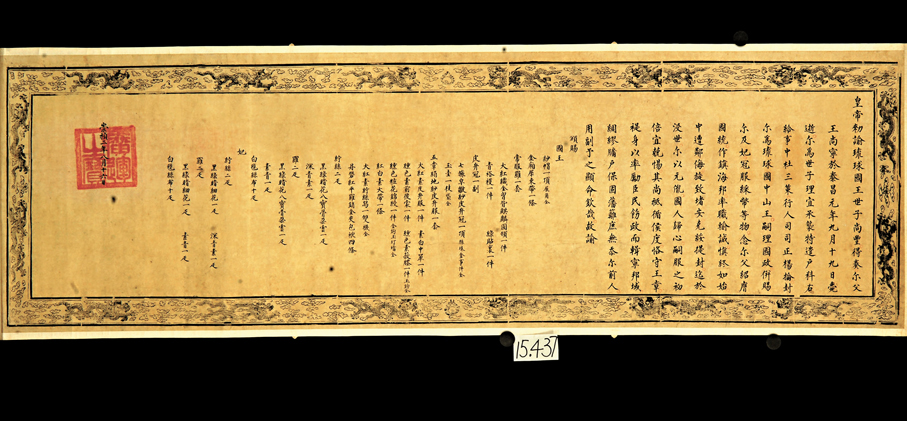 這次展出的「明諭琉球國王敕」係仿製品,原件存放於旅順博物館庫房。敕諭落款為明崇禎二年(公元1629年),為黃色紙本,四周有金色雲龍花紋,鈐有「廣運之寶」朱文方印,行文採用工整的楷書。