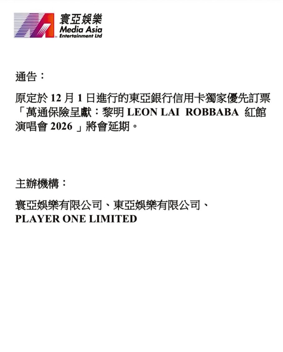 此外,黎明將於明年3月舉行的紅館演唱會,其所屬的唱片公司宣布延期12月1日的優先訂票。TVB亦公布延期12月2日在澳門舉行的新劇《璀璨之城》開鏡禮。