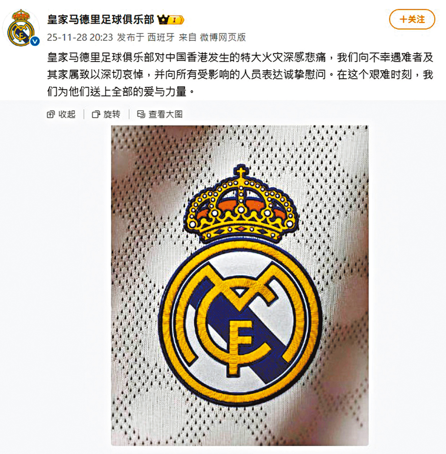 大埔宏福苑火災造成至少128人喪生,多間歐洲球會均有在社交網站悼念死難者,西甲豪門皇家馬德里在微博以中文發帖表示:「皇家馬德里足球俱樂部對中國香港發生的特大火災深感悲痛,我們向不幸遇難者及其家屬致以深切哀悼,並向所有受影響的人員表達誠摯慰問,在這個艱難時刻,我們為他們送上全部的愛與力量。」