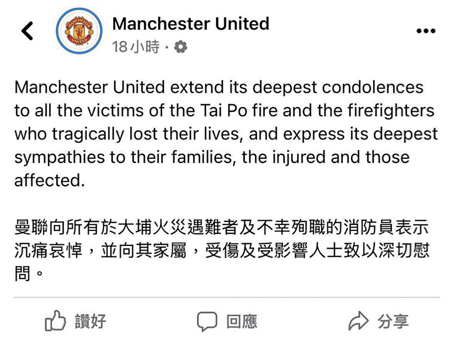 另一間英超球會曼聯及德甲班霸拜仁慕尼黑亦以中英雙語在社交媒體表示哀悼,曼聯在Facebook發文表示:「曼聯向所有於大埔火災遇難者及不幸殉職的消防員表示沉痛哀悼,並向其家屬,受傷及受影響人士致以深切慰問。」阿仙奴亦在Facebook發文:「我們跟所有受香港近期火災影響的人同在,和香港社區站在同一陣線。今年夏天球隊有幸去到香港,感受到球迷們的熱情歡迎和聯繫,阿仙奴大家庭無時無刻都會想念你們。」