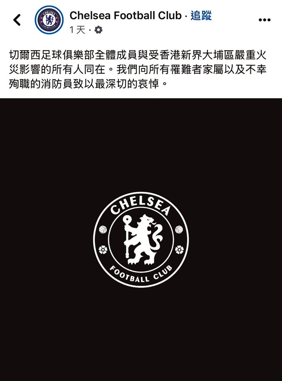 英超球會車路士(內地譯「切爾西」)亦在Facebook發出一幅黑白會徽,並以中文向死難者及不幸殉職的消防員致哀:「切爾西足球俱樂部全體成員與受香港新界大埔區嚴重火災影響的所有人同在。我們向所有罹難者家屬以及不幸殉職的消防員致以最深切的哀悼。」帖文下方有過千個留言,獲大批港人及球迷致謝。