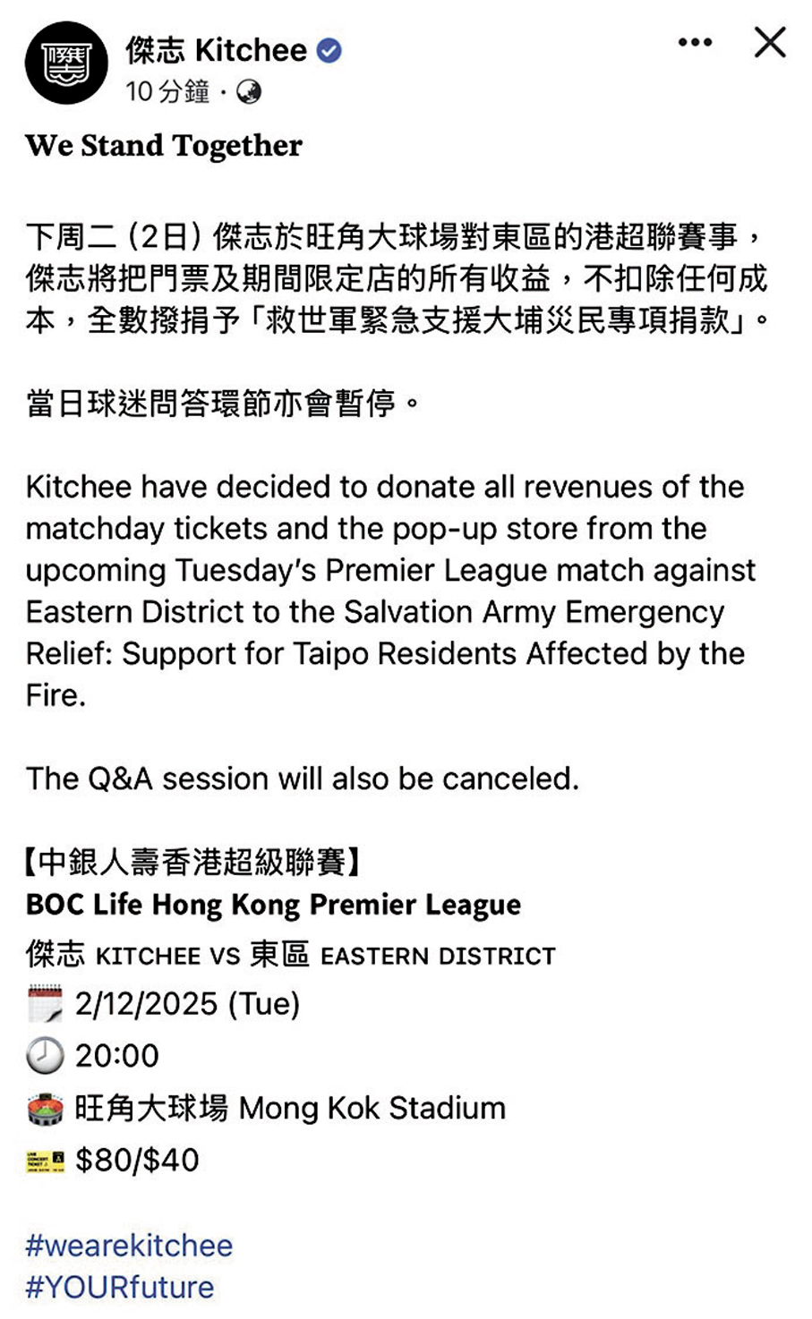 另外,本地球會傑志宣布周二(2日)於旺角大球場對東區的港超聯賽事,將把門票及期間限定店的所有收益,不扣除任何成本,全數撥捐予「救世軍緊急支援大埔災民專項捐款」,而當日球迷問答環節亦會暫停。