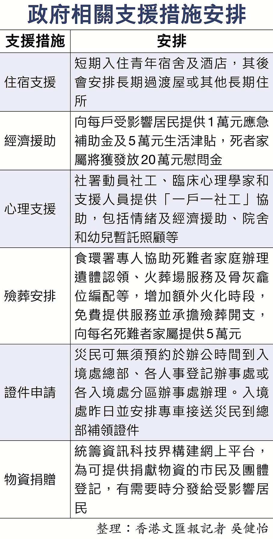 孫玉菡表示,社福界代表已召開會議統籌各方支援,其中東華三院、聖公會等已在富山公眾殮房協助死者家屬,政府及各大慈善機構並提供一系列殮葬、臨床心理學家治療等免費服務,冀減輕家屬的疲累。