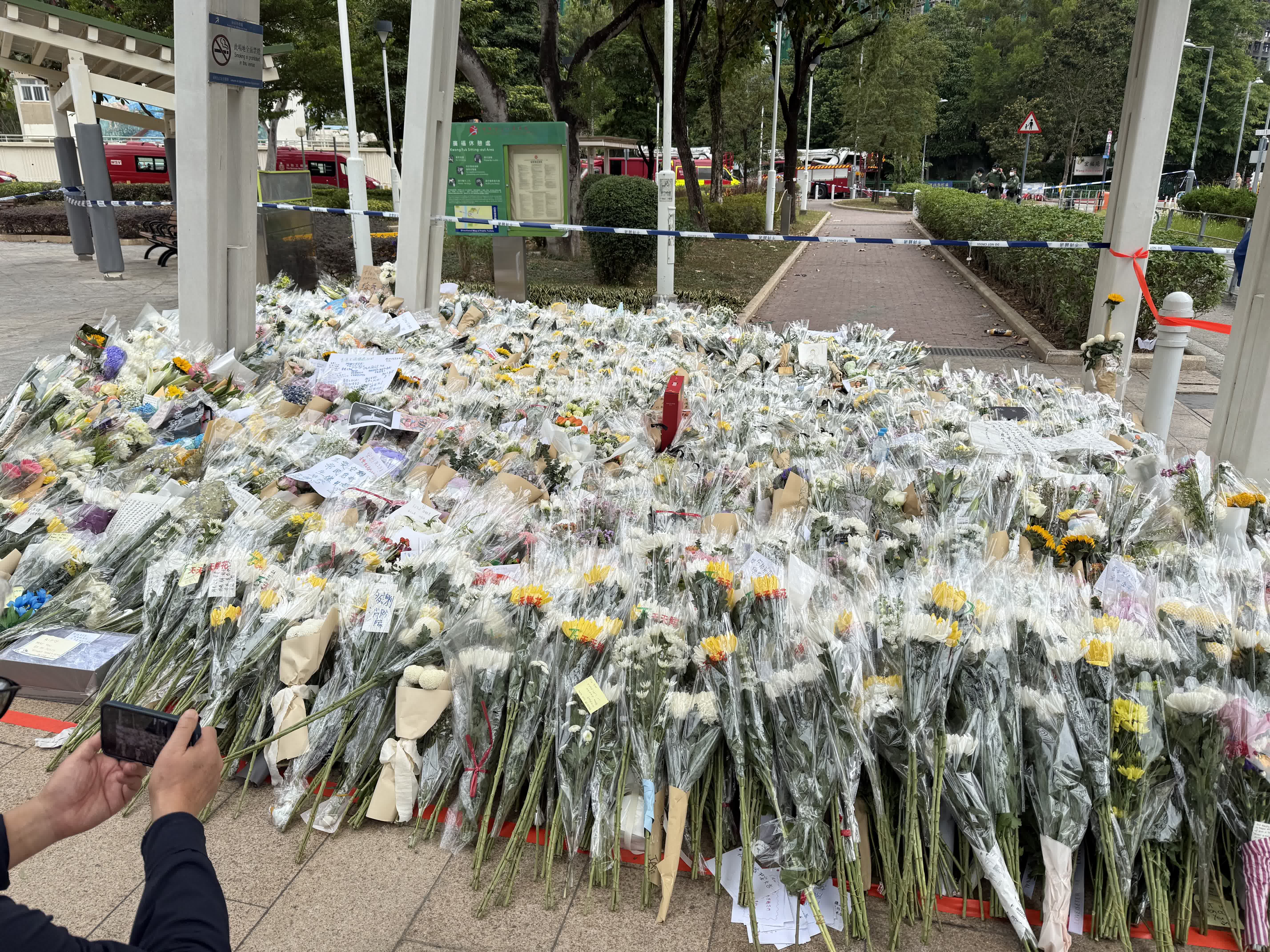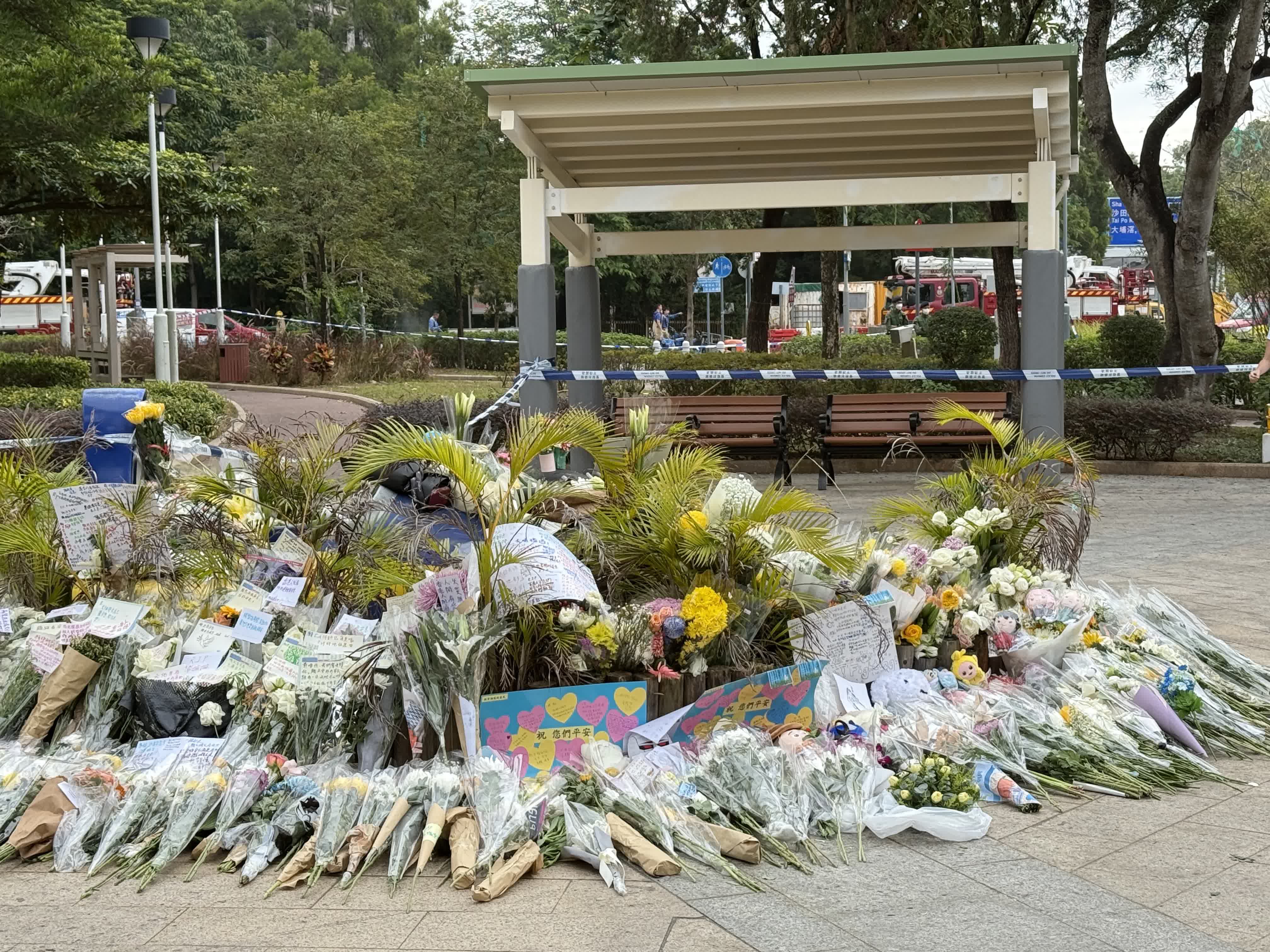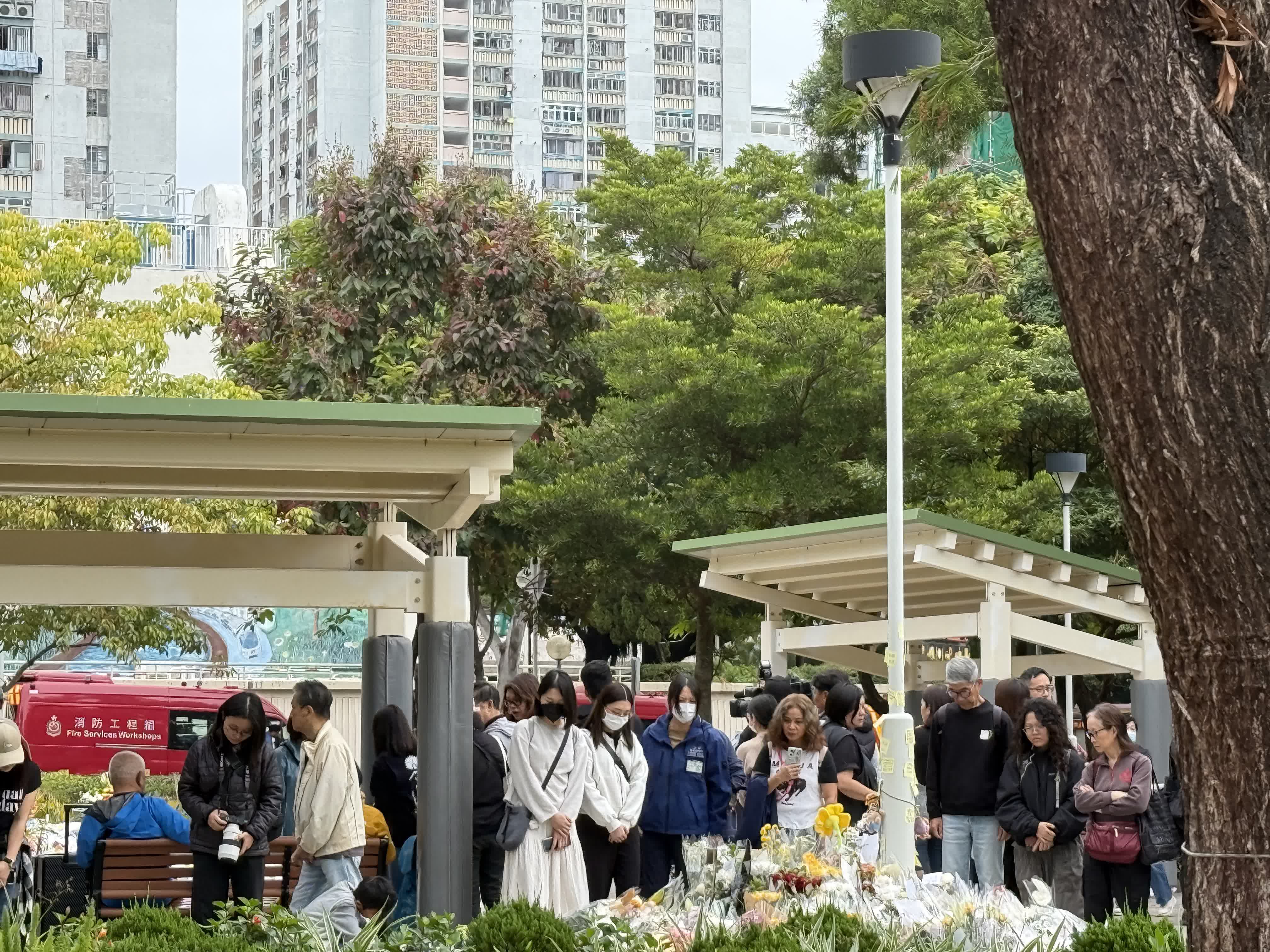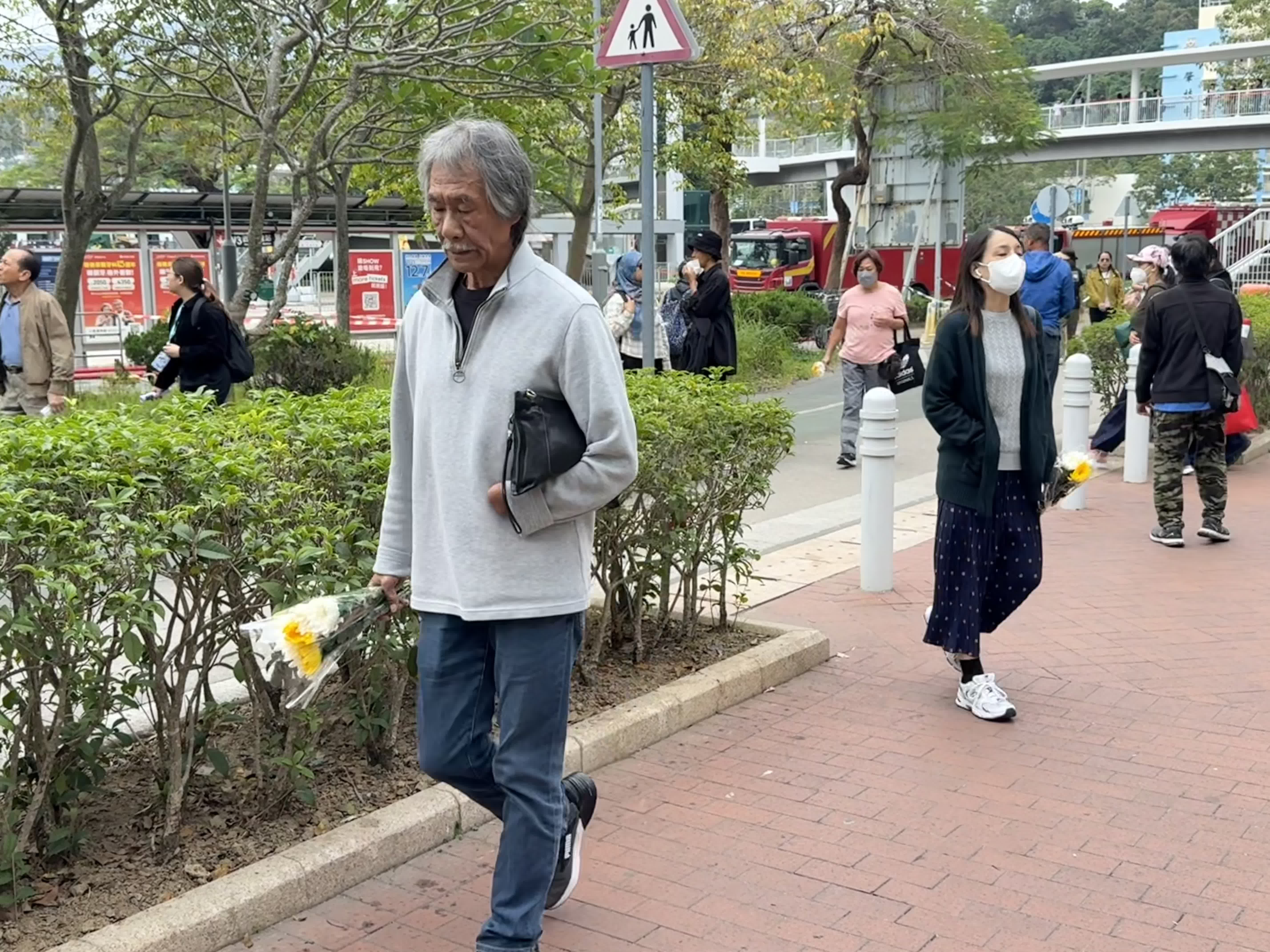 大公文匯全媒體報道:大埔宏福苑11月26日下午發生五級大火,造成嚴重死傷。特區政府昨日(29日)在政府總部舉行悼念儀式,沉痛哀悼在大埔宏福苑火災不幸罹難的人士,全港所有政府建築物及設施的國旗及區旗下半旗誌哀,同時不少市民紛紛前往廣福休憩處獻花悼念罹難者。今日(30日)仍有不少市民攜帶鮮花前往宏福苑附近悼念,早上9時30分,大公文匯全媒體記者看到已有大批市民齊聚宏福苑附近獻花悼念罹難者,還有市民邊走邊落淚。