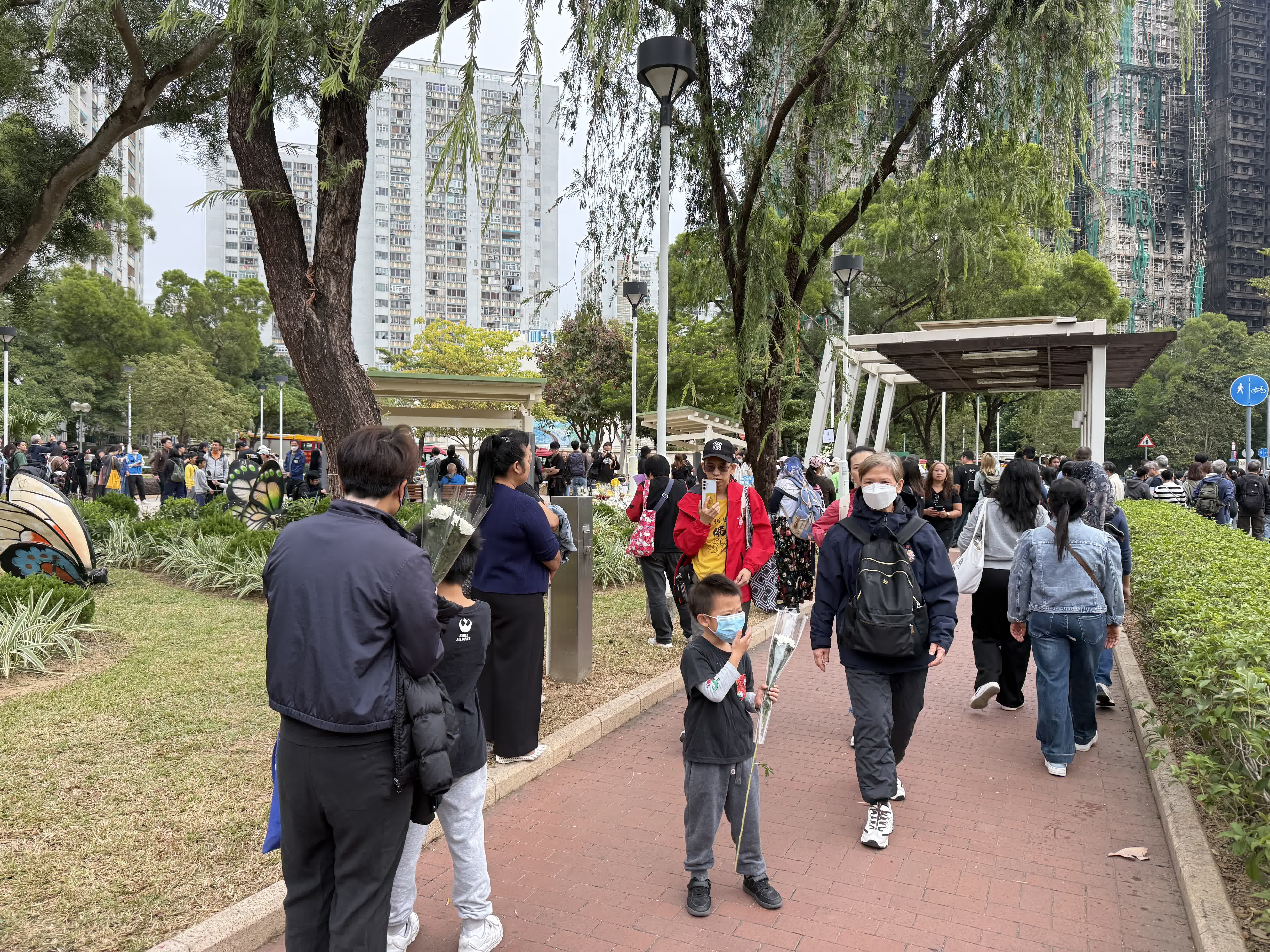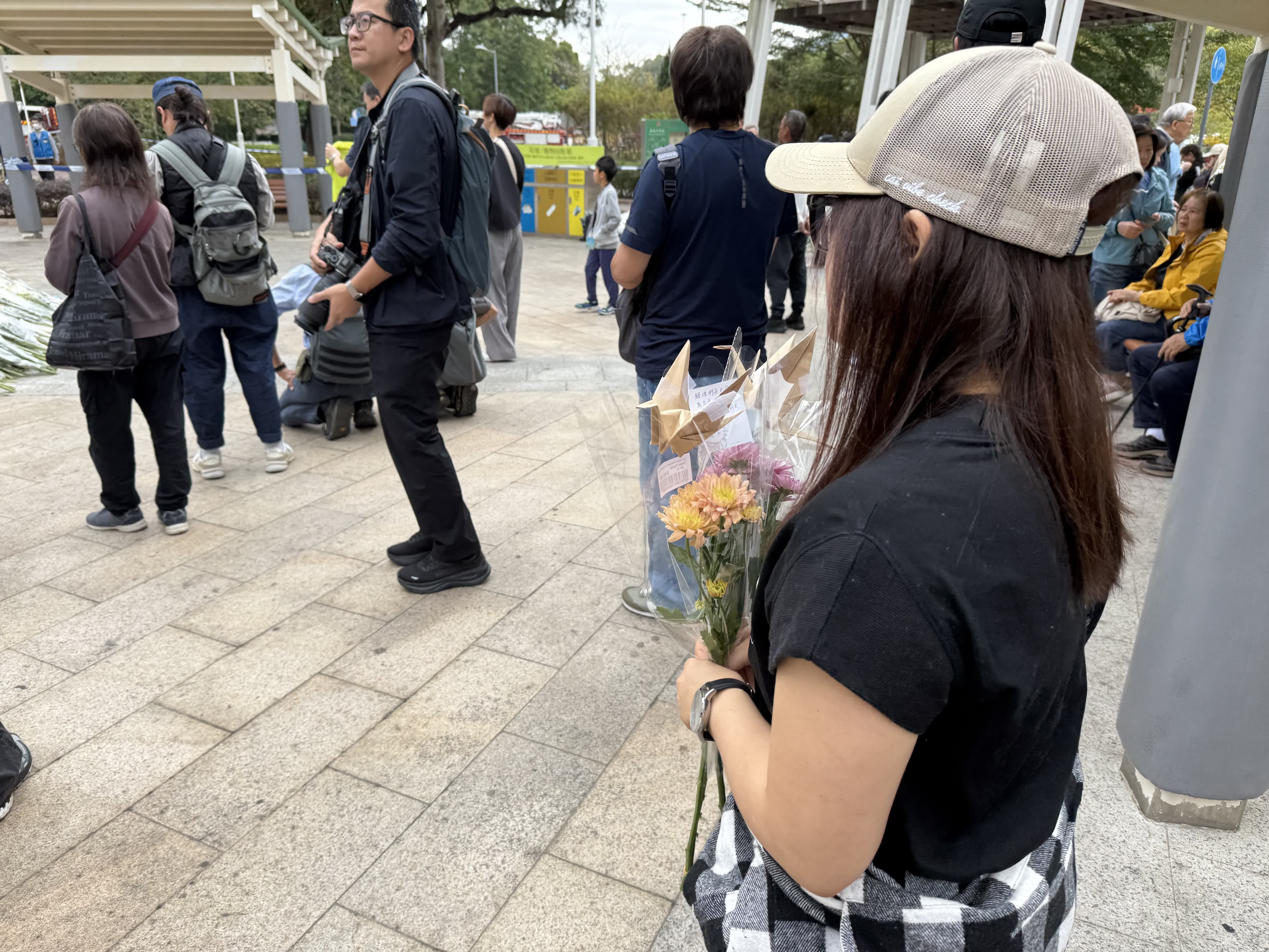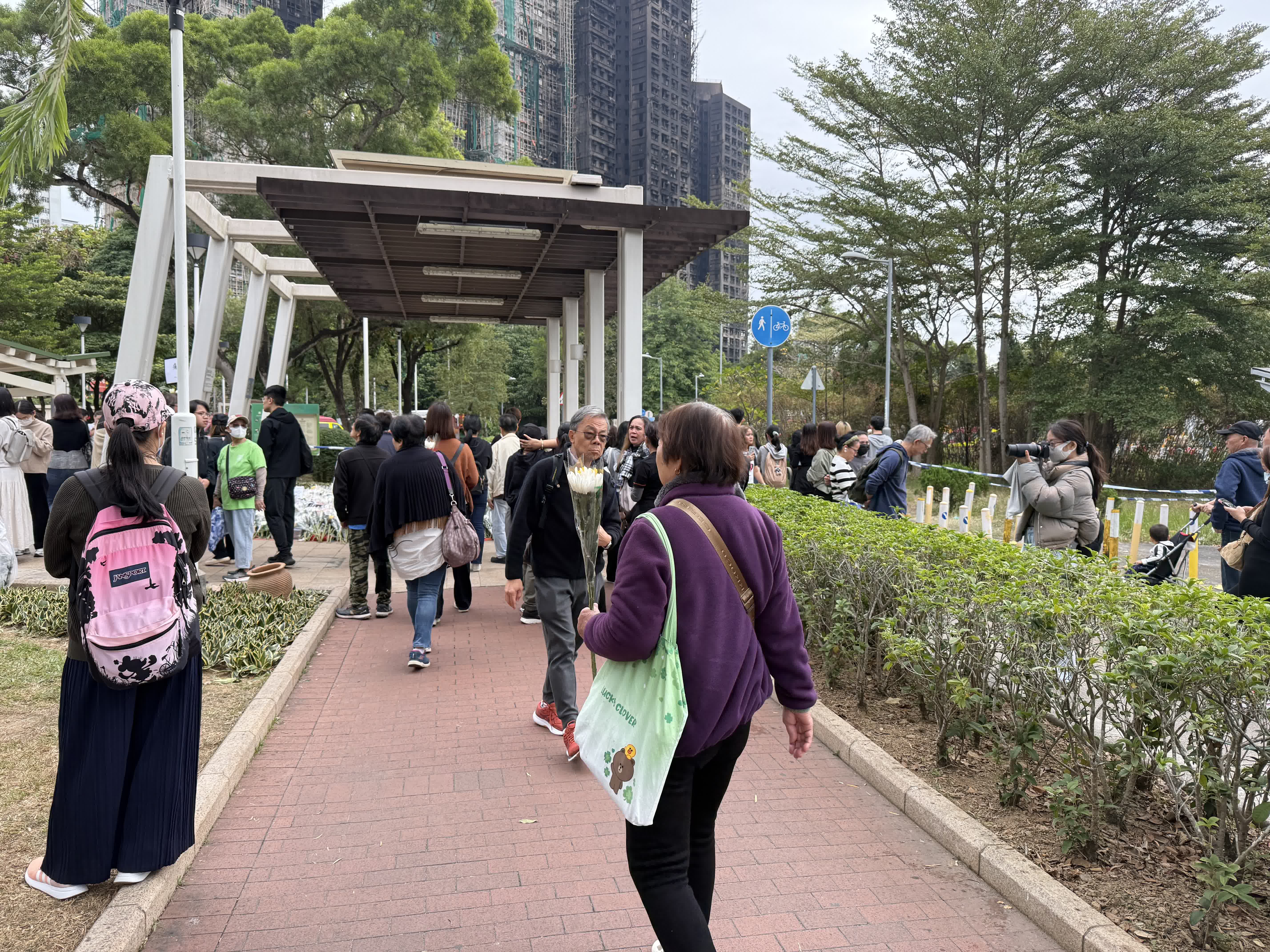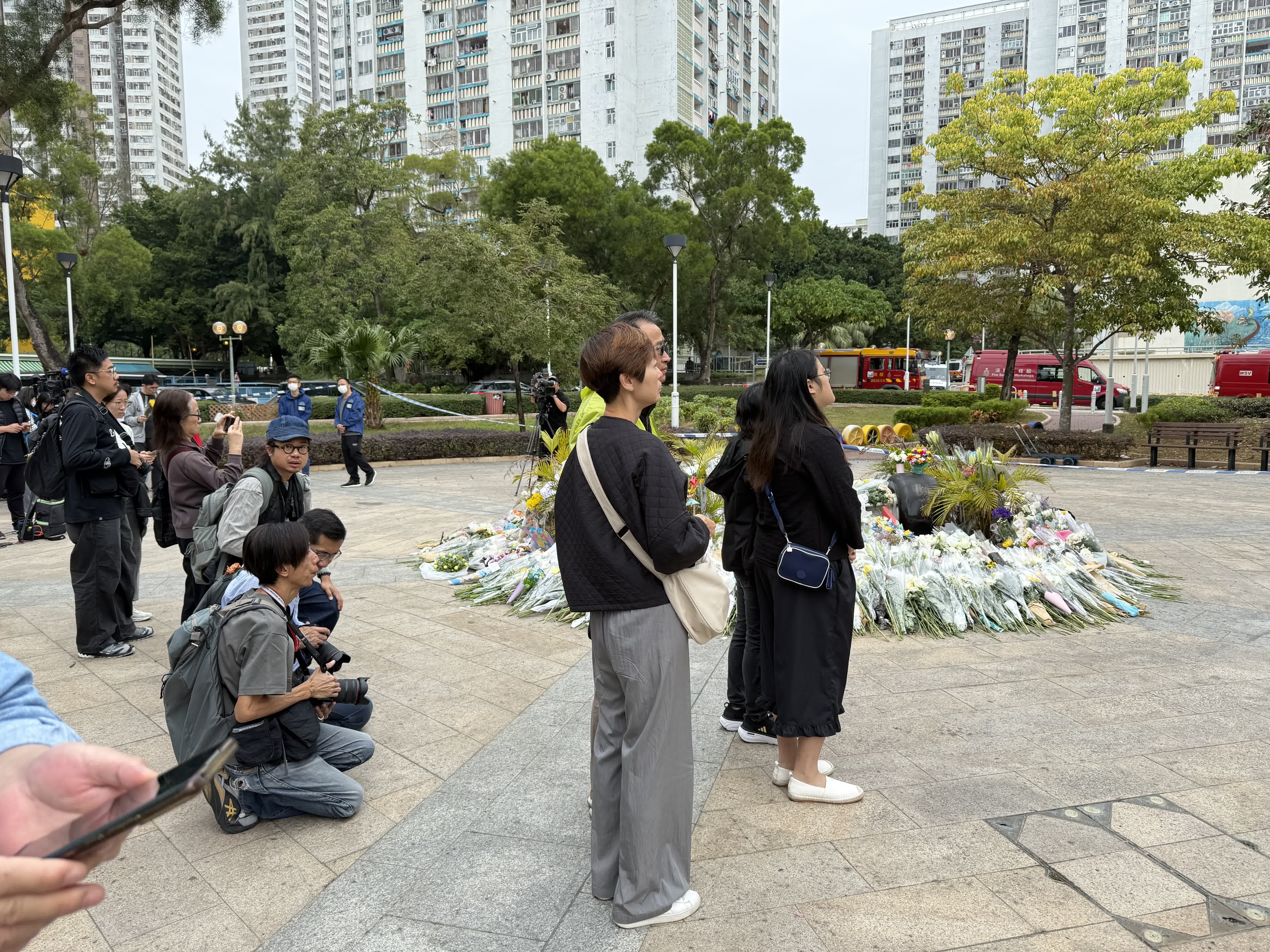 大公文匯全媒體報道:大埔宏福苑11月26日下午發生五級大火,造成嚴重死傷。特區政府昨日(29日)在政府總部舉行悼念儀式,沉痛哀悼在大埔宏福苑火災不幸罹難的人士,全港所有政府建築物及設施的國旗及區旗下半旗誌哀,同時不少市民紛紛前往廣福休憩處獻花悼念罹難者。今日(30日)仍有不少市民攜帶鮮花前往宏福苑附近悼念,早上9時30分,大公文匯全媒體記者看到已有大批市民齊聚宏福苑附近獻花悼念罹難者,還有市民邊走邊落淚。