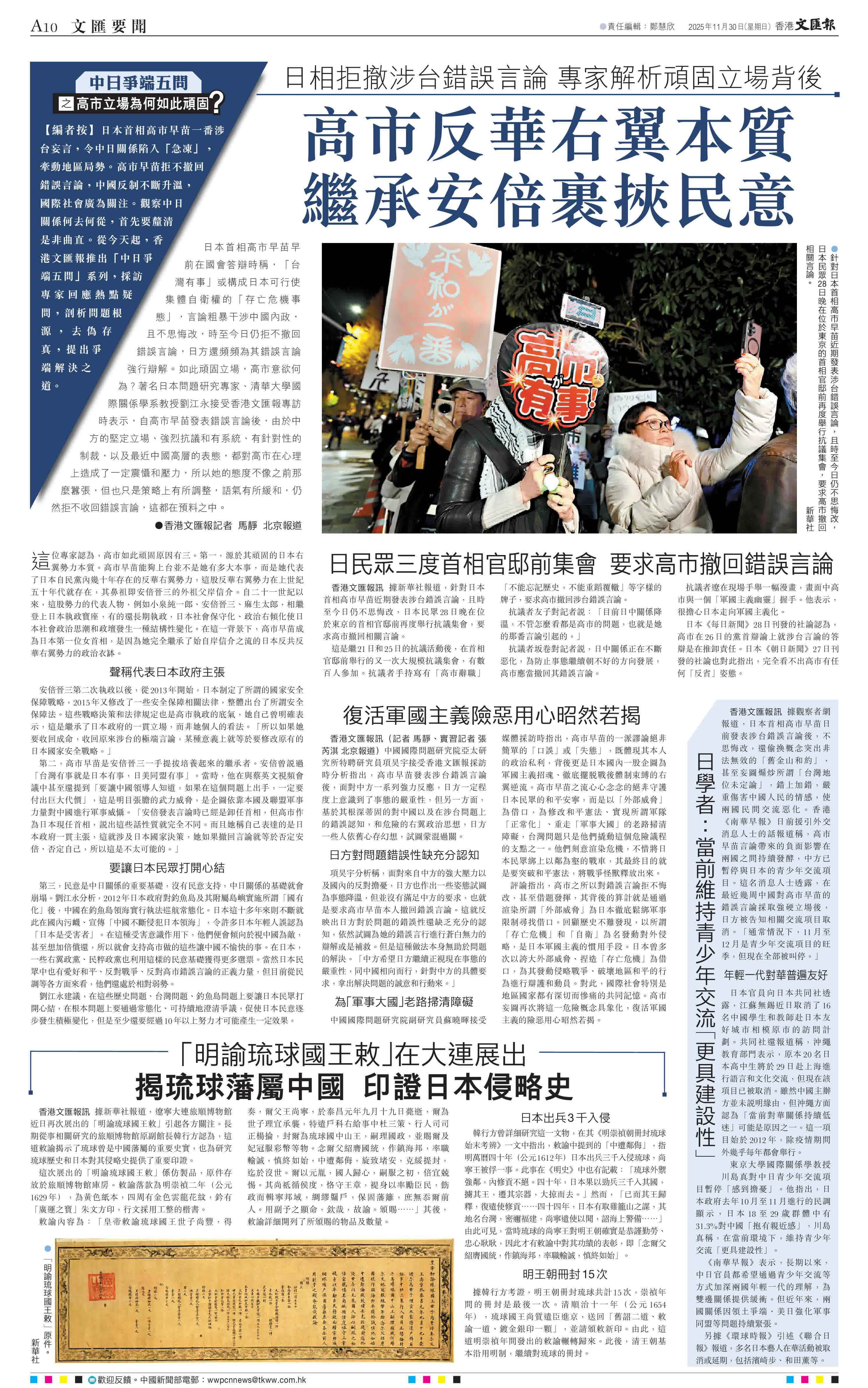編者按:日本首相高市早苗一番涉台妄言,令中日關係陷入「急凍」,牽動地區局勢。高市早苗拒不撤回錯誤言論,中國反制不斷升溫,國際社會廣為關注。觀察中日關係何去何從,首先要釐清是非曲直。從今天起,香港文匯報推出「中日爭端五問」系列,採訪專家回應熱點疑問,剖析問題根源,去偽存真,提出爭端解決之道。