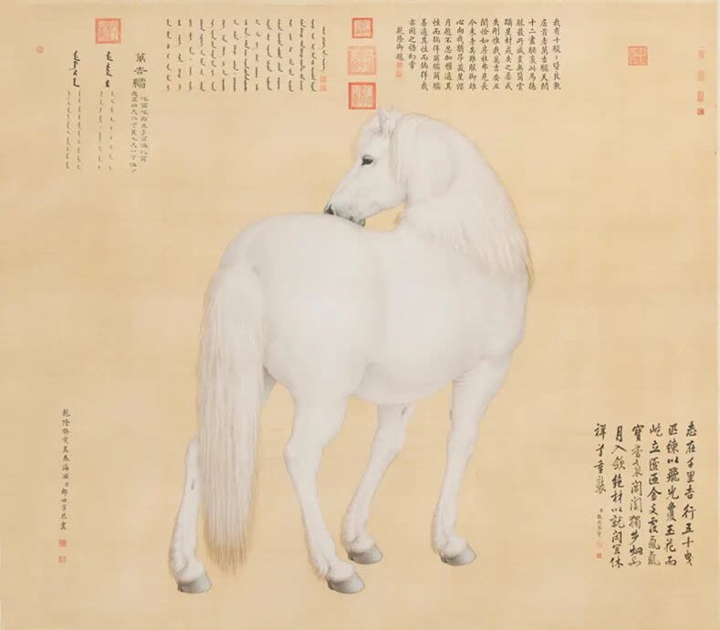 這四匹駿馬身世顯赫,它們皆是清代乾隆皇帝的御騎愛駒。為此,乾隆皇帝特命宮廷畫師郎世寧為它們繪製肖像。郎世寧筆觸精妙,駿馬神采躍然紙上。如今,在這本日曆中,讀者得以感受它們一如往昔的靈動英姿。
