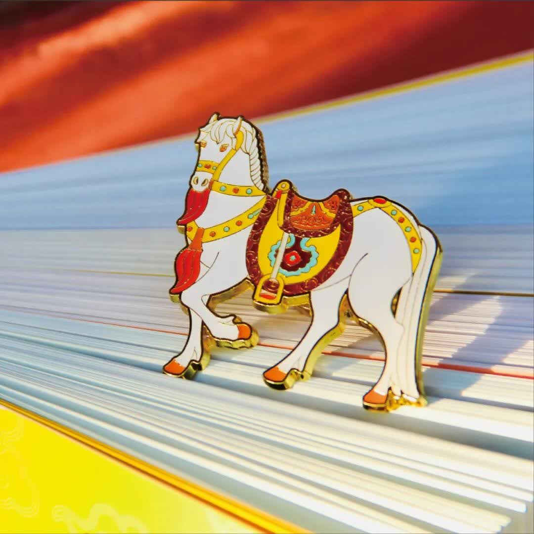 《故宮日曆》青春版特別附贈一枚以清代郎世寧《乾隆皇帝大閱圖》軸中御馬為設計原型,集「冰箱貼」與「痛包徽章」雙功能於一體的精美文創。它再現了乾隆皇帝閱兵時所乘駿馬萬吉驦的風采,並可一物兩用:既能作為冰箱貼點綴家居,更能輕鬆佩戴於上衣、背包之上,滿足不同場景的使用需要。