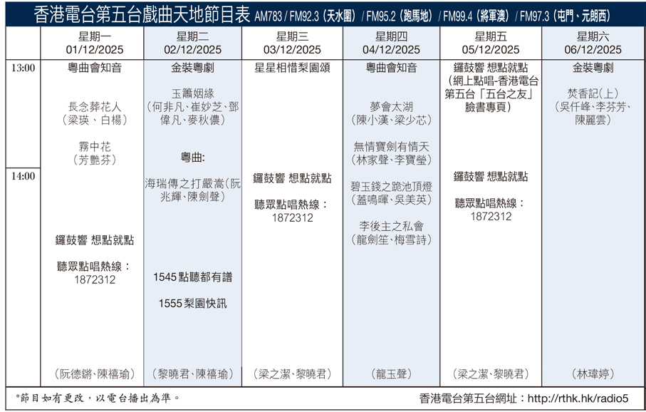 香港電台第五台戲曲天地節目表