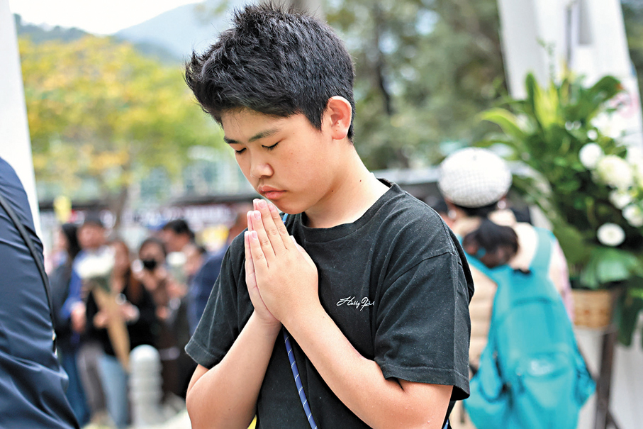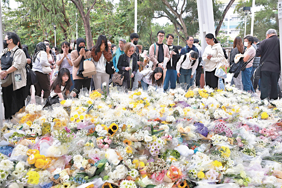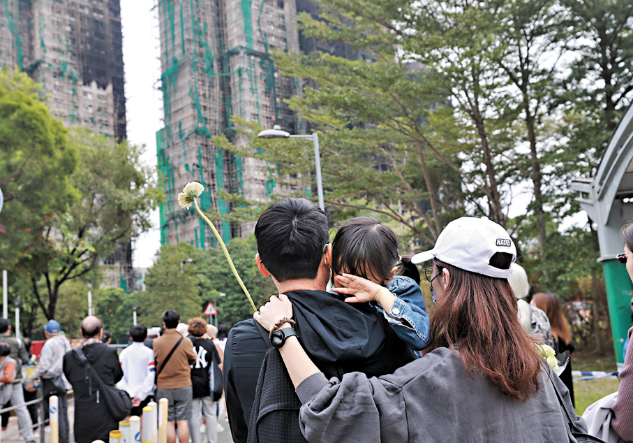 昏暗天氣下,十八區弔唁處昨日排起延綿人龍,其中毗鄰火災現場的廣福休憩處外獻花的人龍蜿蜒逾兩公里,輪候時間動輒一小時,苦等卻沒有怨言、沒有不耐煩,人們靜靜地、井然有序地輪候,有人垂頭憶起昔日濃濃的街坊情一夜間化灰燼;有人喃喃祈禱;有人縱然與傷亡者素未謀面,但在同一獅子山下休戚與共,遠道而來悼念,讓罹難者的家庭知道:你們從不孤單!因為一方有難,八方支援;也有內地市民專程來誌哀,「因為咱們都是一家人!」亦有外籍家庭傭工向在火災中喪生的同鄉表心意。無論什麼原因,大家最大的心願都是:「願逝者安息,生者振作,加油!往前看!」