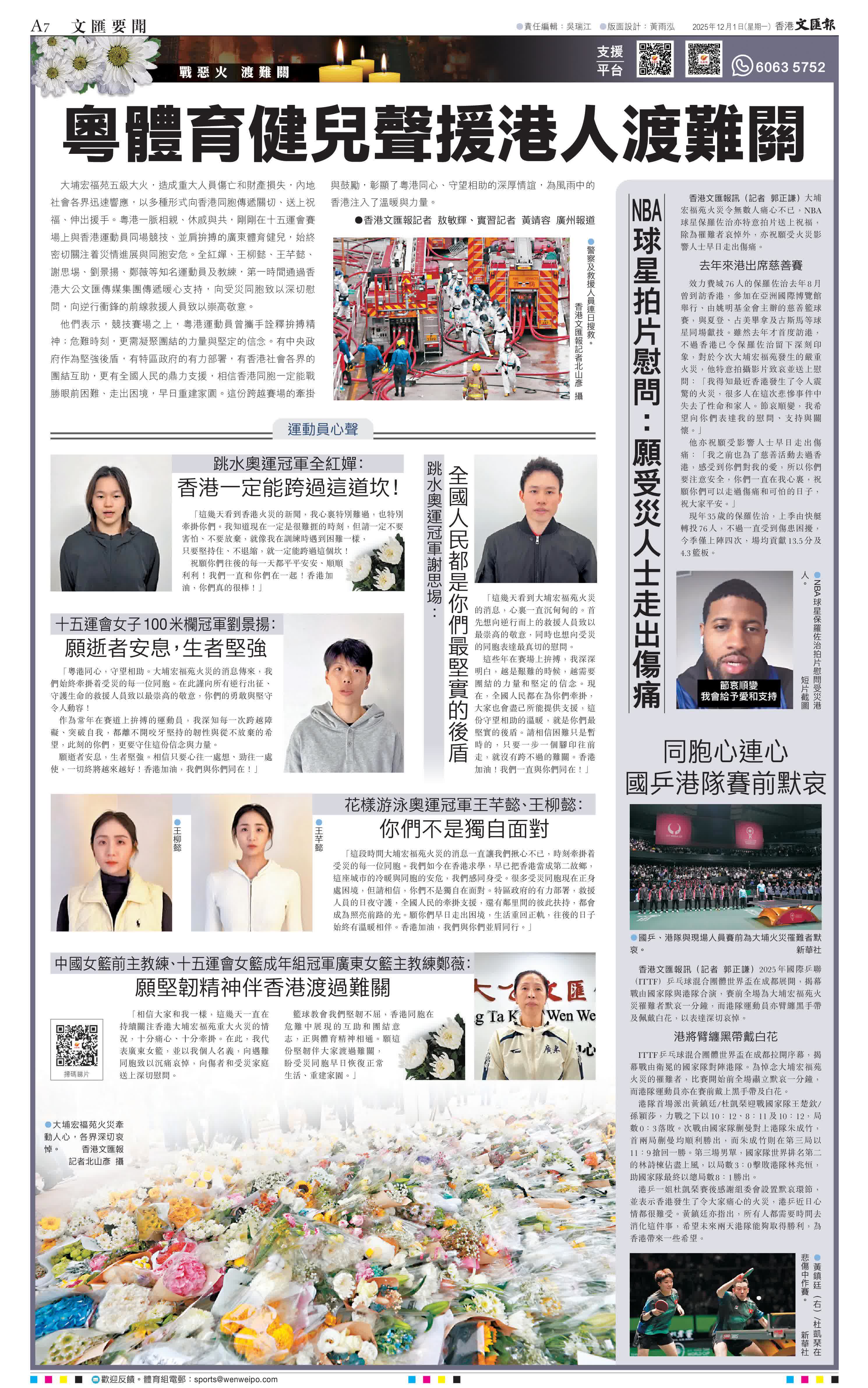 (香港文匯報記者 敖敏輝、實習記者 黃靖容 廣州報道)大埔宏福苑五級大火,造成重大人員傷亡和財產損失,內地社會各界迅速響應,以多種形式向香港同胞傳遞關切、送上祝福、伸出援手。粵港一脈相親、休戚與共,剛剛在十五運會賽場上與香港運動員同場競技、並肩拚搏的廣東體育健兒,始終密切關注着災情進展與同胞安危。全紅嬋、王柳懿、王芊懿、謝思埸、劉景揚、鄭薇等知名運動員及教練,第一時間通過香港大公文匯傳媒集團傳遞暖心支持,向受災同胞致以深切慰問,向逆行衝鋒的前線救援人員致以崇高敬意。