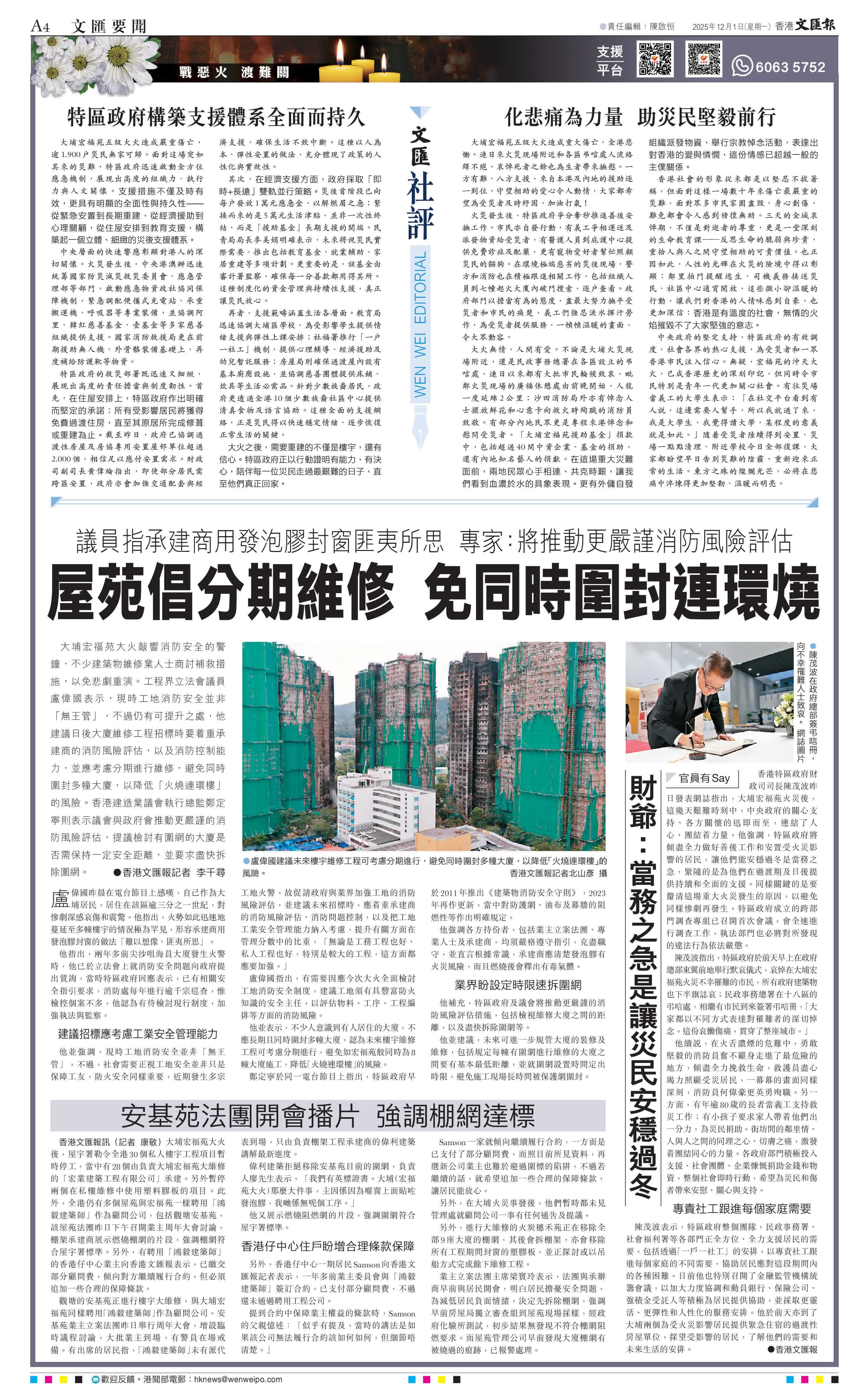 他補充,特區政府及議會將推動更嚴謹的消防風險評估措施,包括檢視維修大廈之間的距離,以及盡快拆除圍網等。