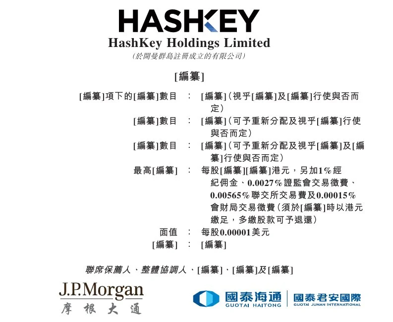 香港文匯報訊(記者 黎梓田)HashKey Holdings Limited(簡稱:HashKey)通過港交所主板上市聆訊,摩根大通、國泰海通及國泰君安國際為其聯席保薦人。