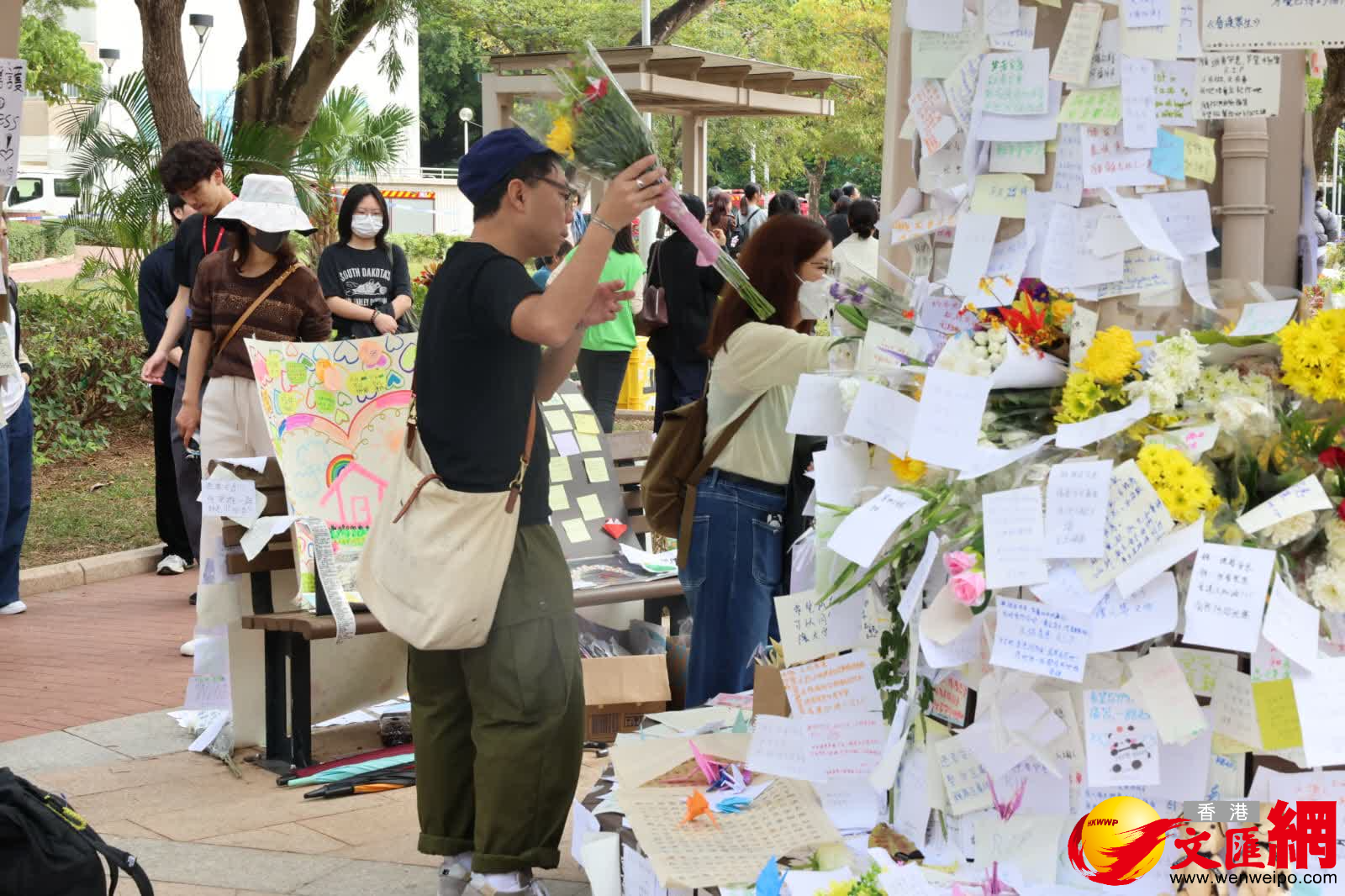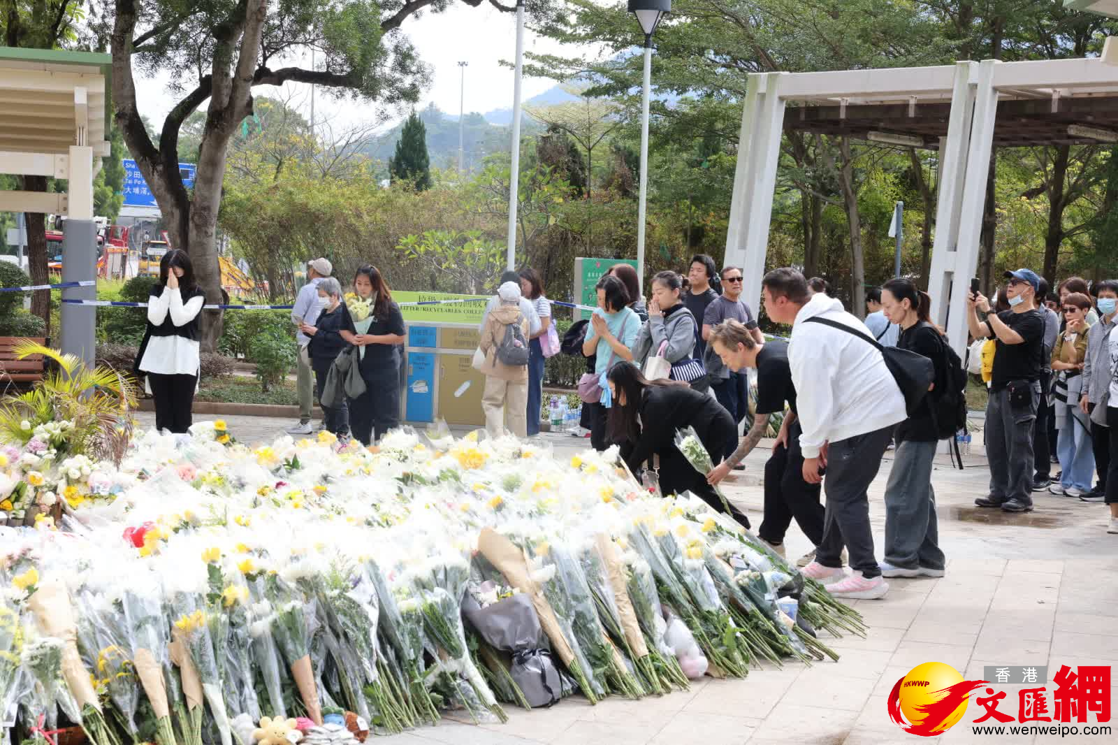 香港文匯報訊(記者 蕭景源)大埔宏福苑在上周三(26日)發生的五級大火,至今已造成至少146人死亡、79人受傷,有54具遺體有待辨認。今日(12月1日),有不少市民手持鮮花及心意卡,絡繹不絕從不同地方抵達廣福休憩處放下鮮花,其中有市民跪地上香拜祭,有市民寫上心意字貼貼在長凳及柱,更有人送上花牌,以及專誠帶來毛公仔等玩具,一起哀悼火災中的遇難者,並祝福傷者早日康復,他們的親友能夠早日走出傷痛。